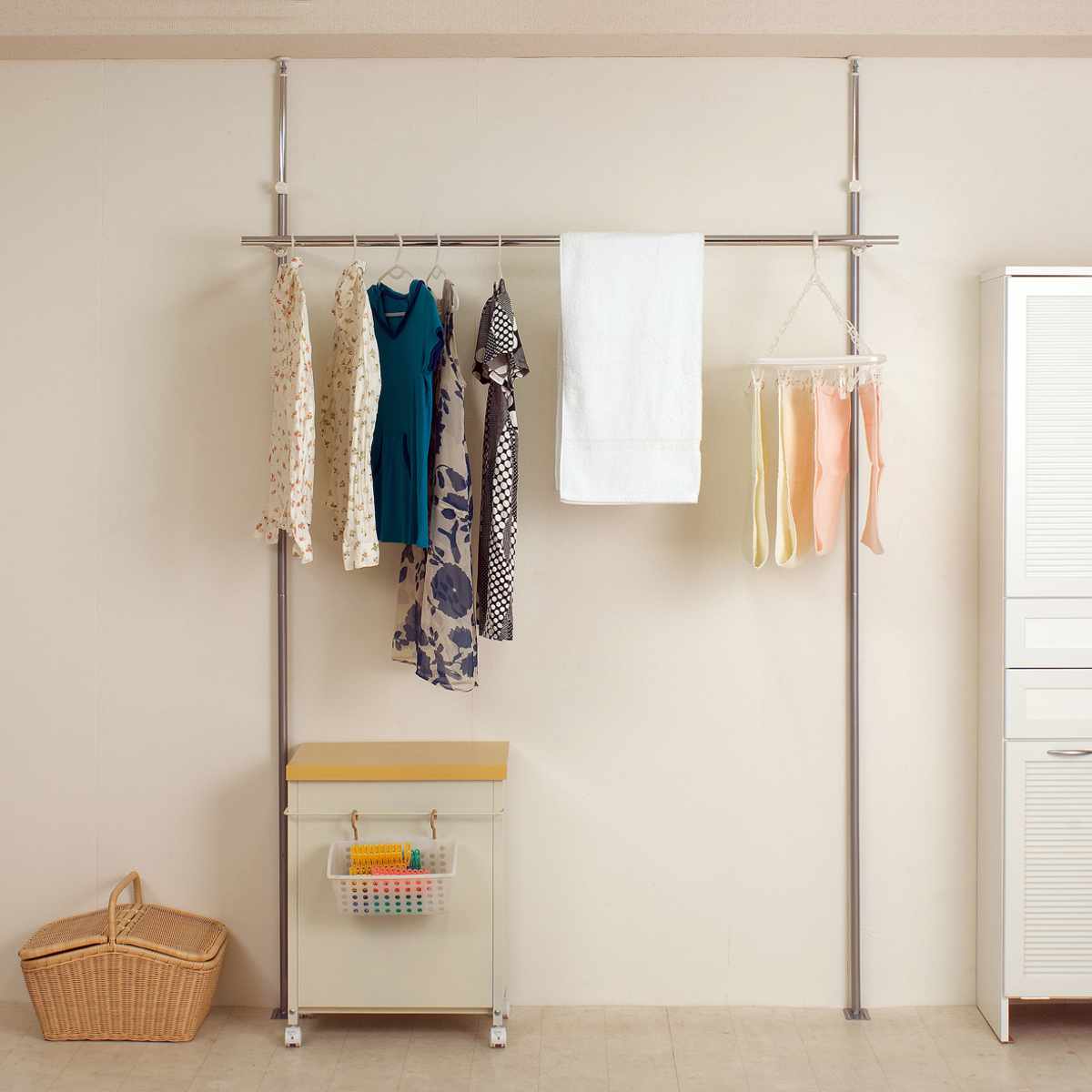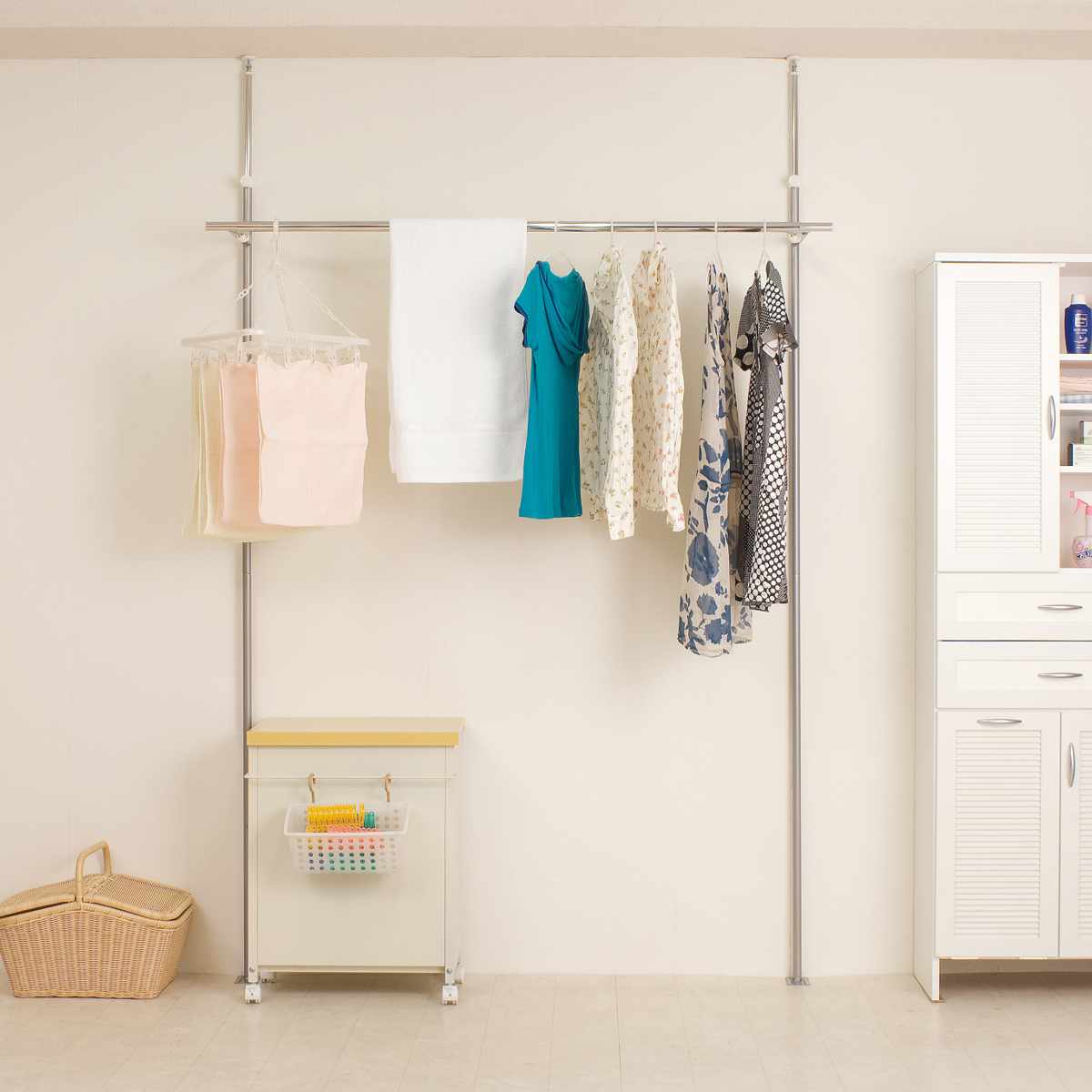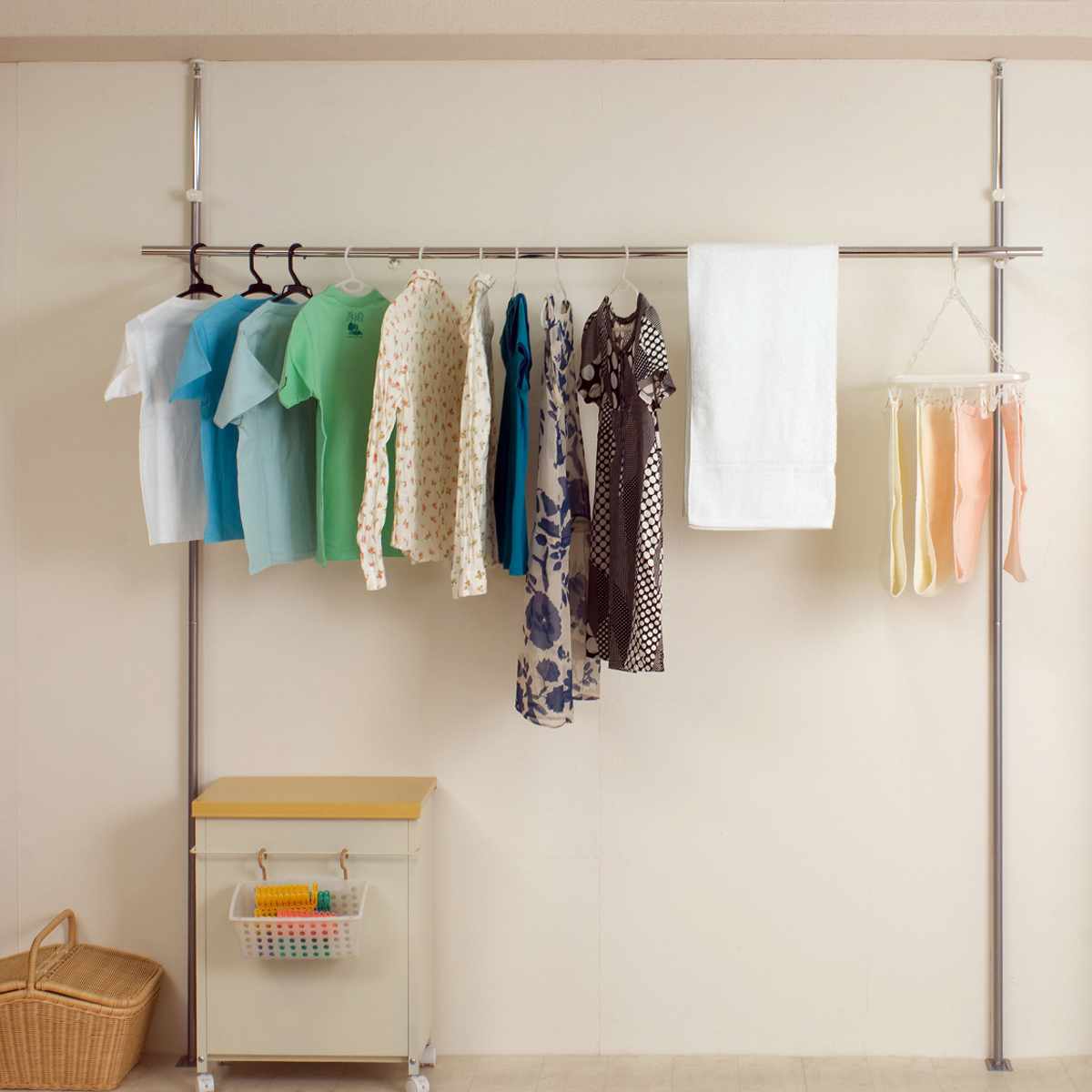 使う場所や干す物に合わせて、幅も高さも自由に調整可能です。バスタオルからワンピースまでしっかり干せます。