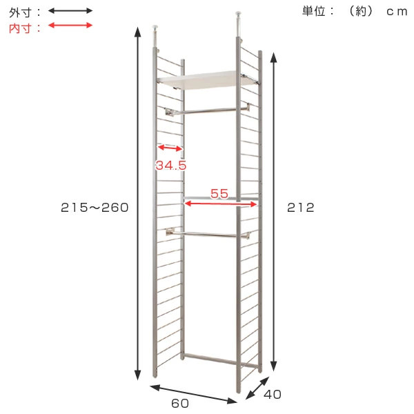 | サイズ | 本体:(約)幅60×奥行40×高さ215~260(cm) 収納部内寸:(約)幅55×奥行34.5×高さ(ハンガーバーを上下ほぼ均等に設置した場合)(上部:93)(下部:90)(cm) ラダー間隔:(約)8(cm) |