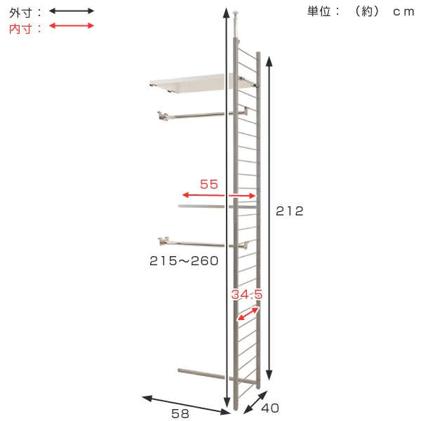 | サイズ | 本体:(約)幅58×奥行40×高さ215~260(cm) 収納部内寸:(約)幅55×奥行34.5×高さ(ハンガーバーを上下ほぼ均等に設置した場合)(上部:93)(下部:90)(cm) ラダー間隔:(約)8cm |