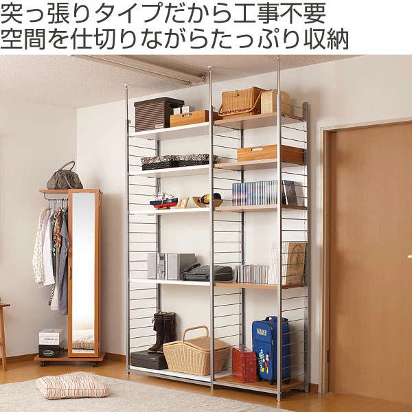 組み合わせてさらに収納力UP突っ張り間仕切りラックは、お洋服の収納に便利な【ワードローブタイプ】と、本棚やディスプレイ収納にも使える【ラックタイプ】の二種類からお選びいただけます。本体単品でのご使用はもちろん、連結用パーツと組み合わせると収納力が大幅にUP。お気に入りのお洋服も全巻そろえた本も、たっぷりと収納できます。