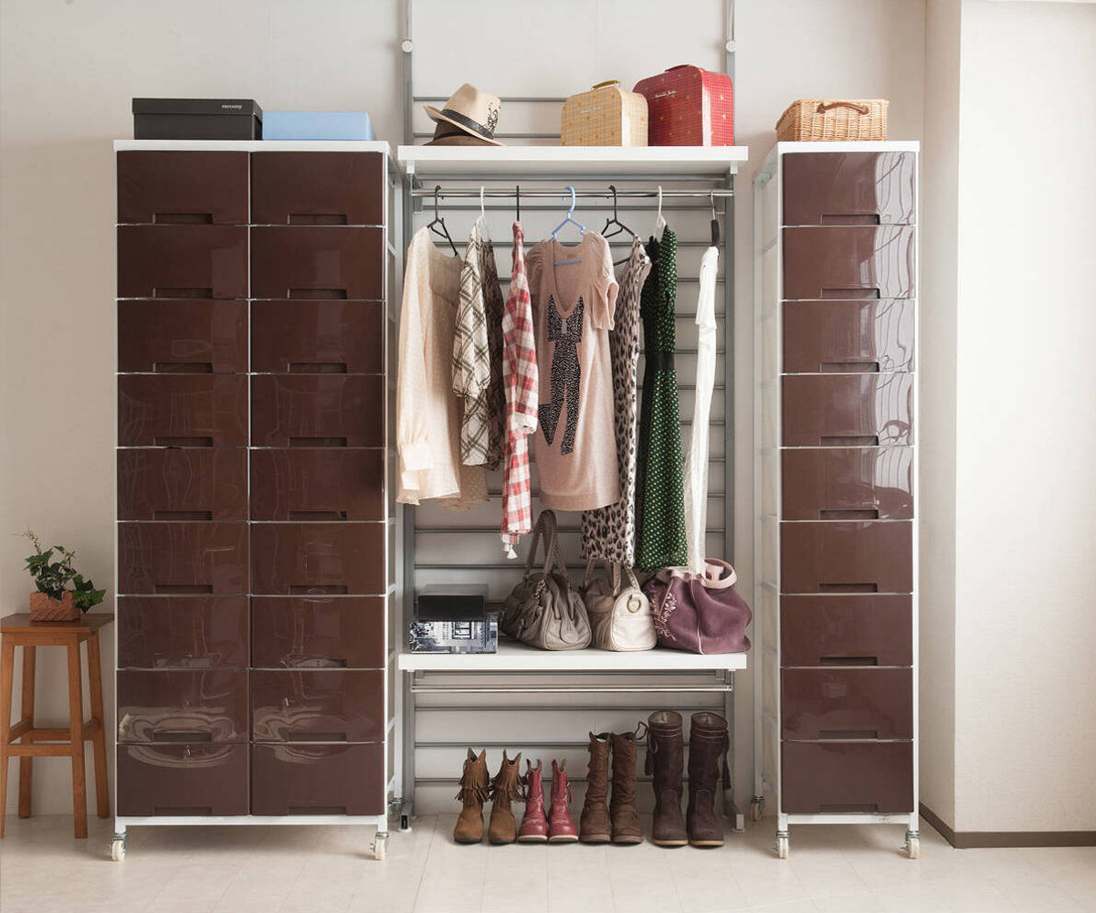 収納スペースに合わせてチェストを組み合わたり、同シリーズの「ハンガーラック付きチェスト」や「ハンガーラック」と組み合わて収納力をアップさせたり、ホワイトとブラウンを交互に組み合わせてみたり。アイディア次第で自由にアレンジしていただけます。