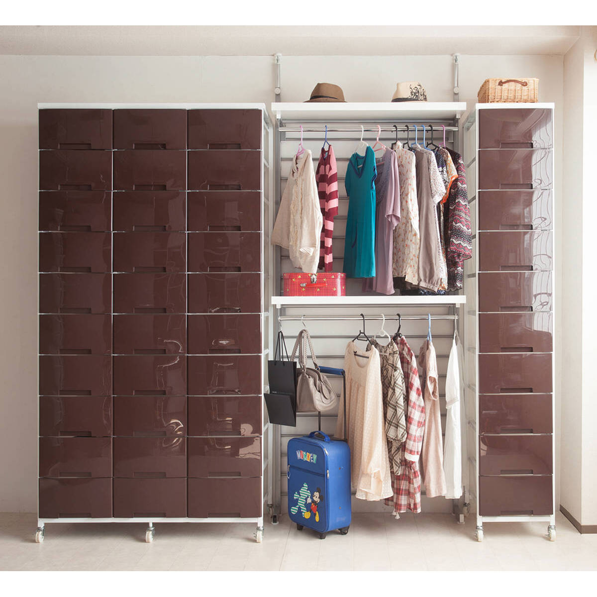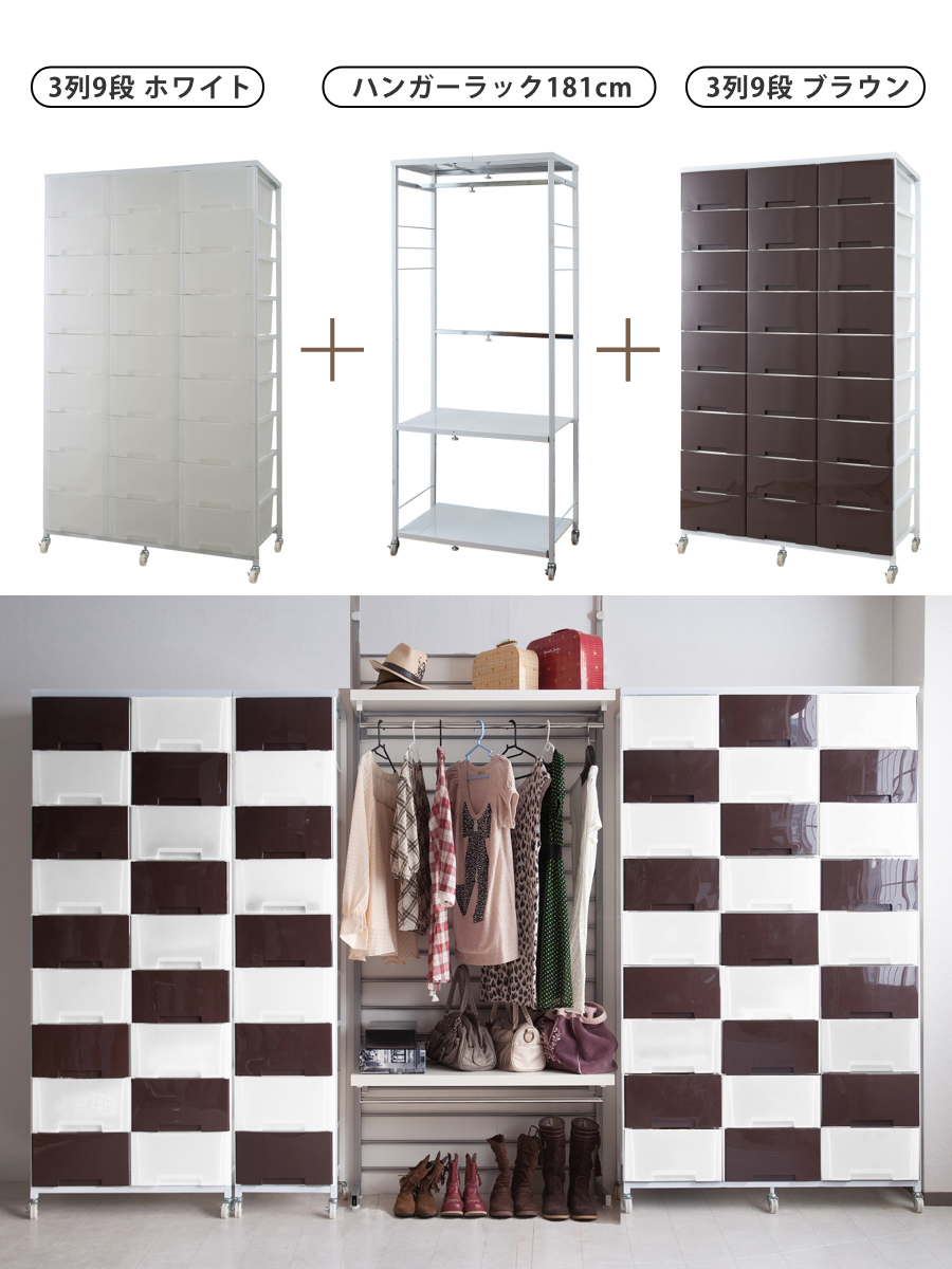 収納スペースに合わせてチェストを組み合わたり、同シリーズの「ハンガーラック付きチェスト」や「ハンガーラック」と組み合わて収納力をアップさせたり、ホワイトとブラウンを交互に組み合わせてみたり。アイディア次第で自由にアレンジしていただけます。