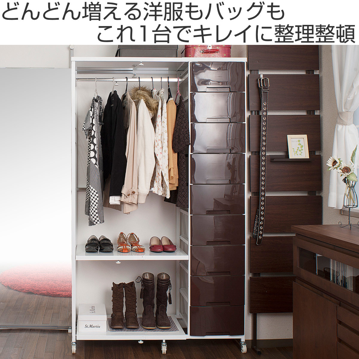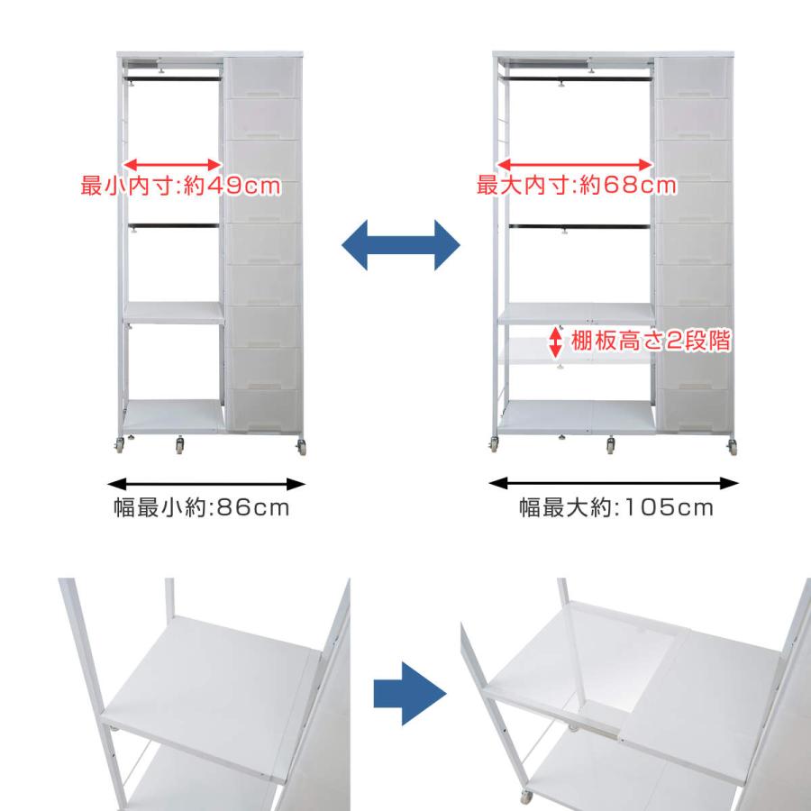 収納ケース ハンガー付きプラスチックチェスト 引き出し 9段 高さ181cm ハンガーラック ( 幅86~105cm 伸縮 収納 衣類 キャスター付き 収納ボックス 日本製 パイプハンガー 収納棚 衣装ケース 衣類収納 収納ラック 大容量 洋服 ) 【ホワイト】