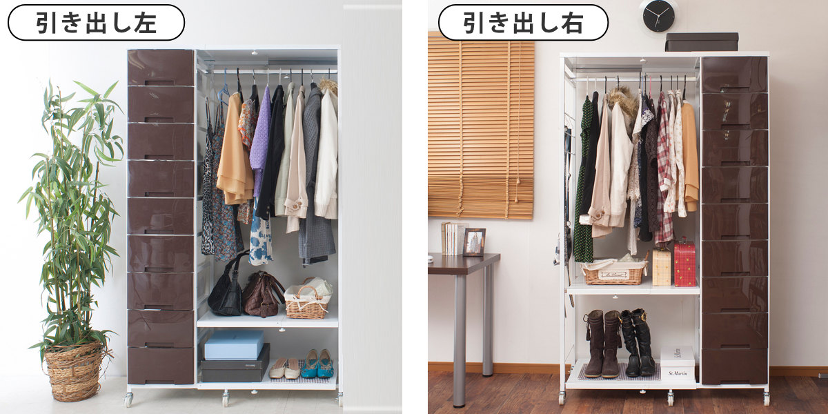 組立時に、引き出しとハンガーラックの位置を左右それぞれどちらにするか、お部屋に合わせて選べます。