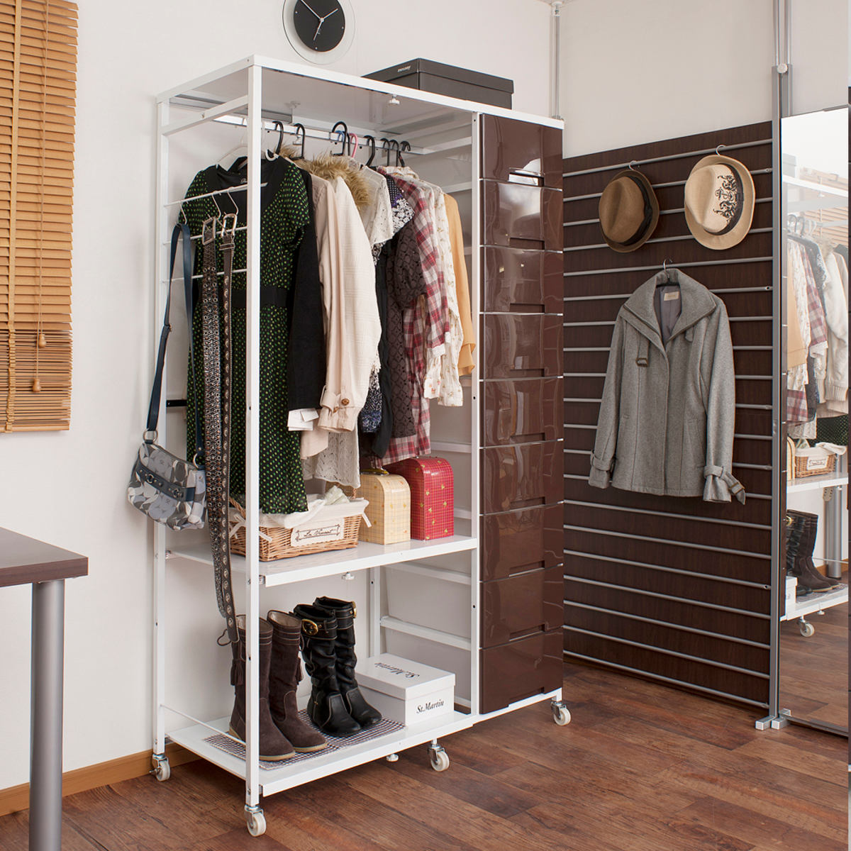 ごちゃつきがちな洋服やカバン、小物も、まとめて綺麗に整理整頓できる引き出し&ハンガーラックです。天板にもカバンなどを置けて便利です。リビングや書斎、子ども部屋でも使いやすさ抜群です。お部屋が明るくなるホワイトと、落ち着いた雰囲気のブラウンの2色展開です。
