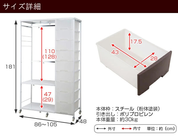 | サイズ | 本体:約 幅86~105×奥行48×高さ181(cm) ハンガー下高さ:ハンガー下高さ/棚板上部セット時:約 上110下47(cm)、棚板下部セット時:約 上128下29(cm)、ハンガー幅:約49~68cm 引き出し内寸:約 幅28×奥行43×高さ17.5(cm) |