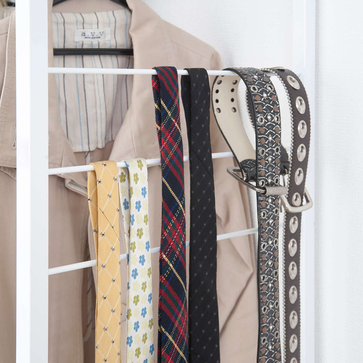 サイドのバーにベルトやネクタイを掛けたり、フックを付けて小物やカバンを吊るしたりすることで、小物類を取りやすく収納できます。