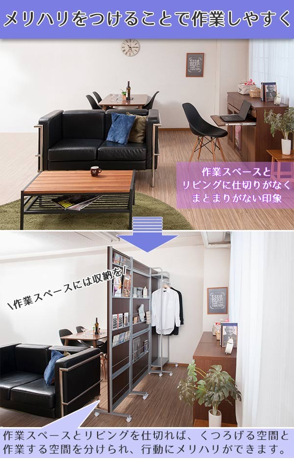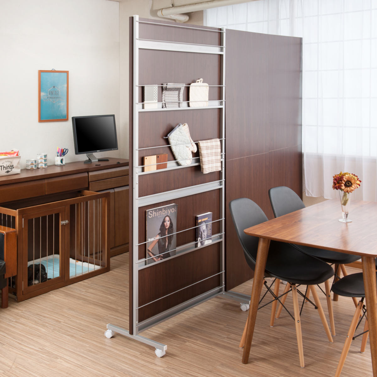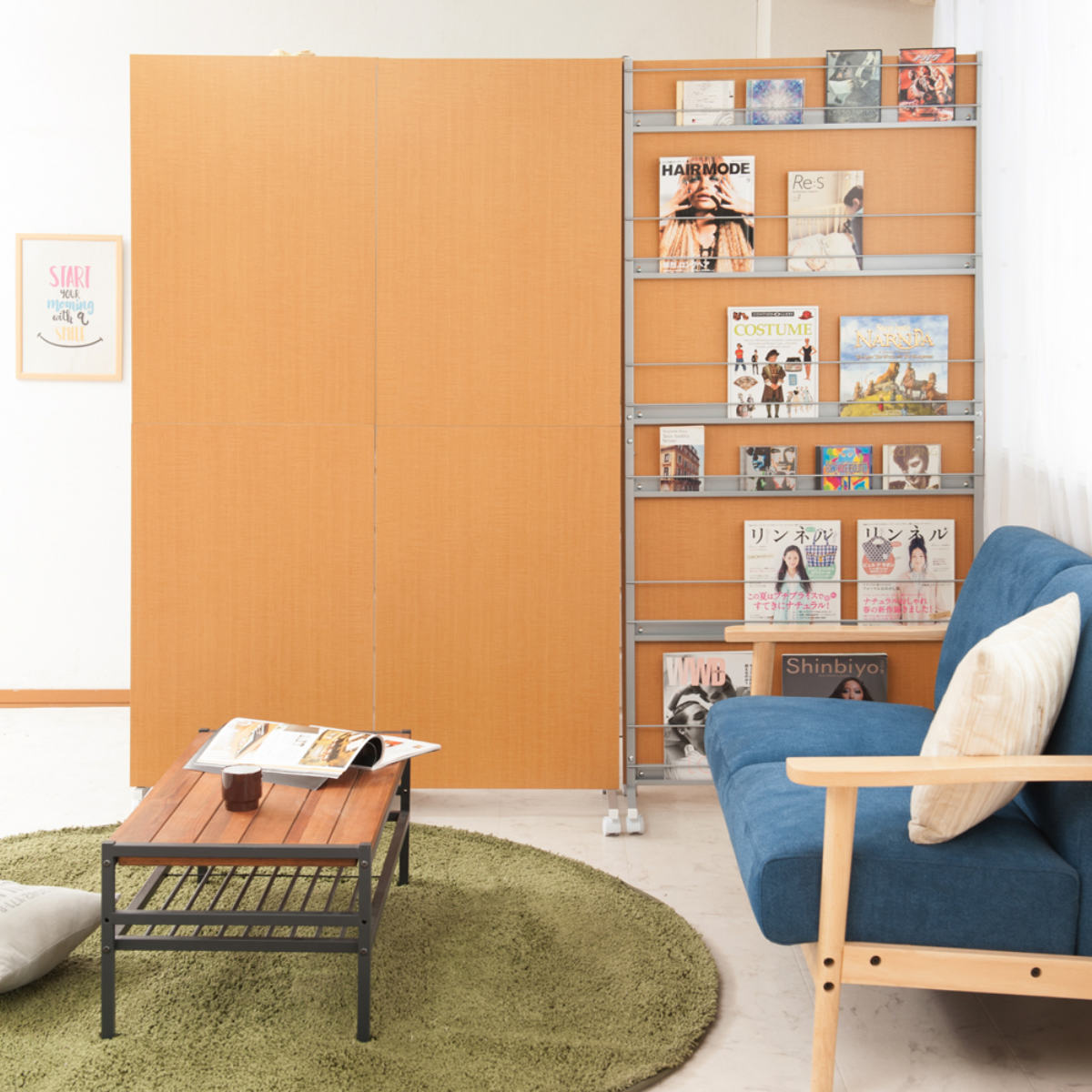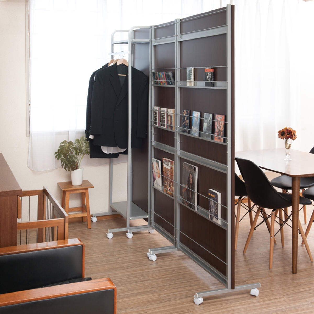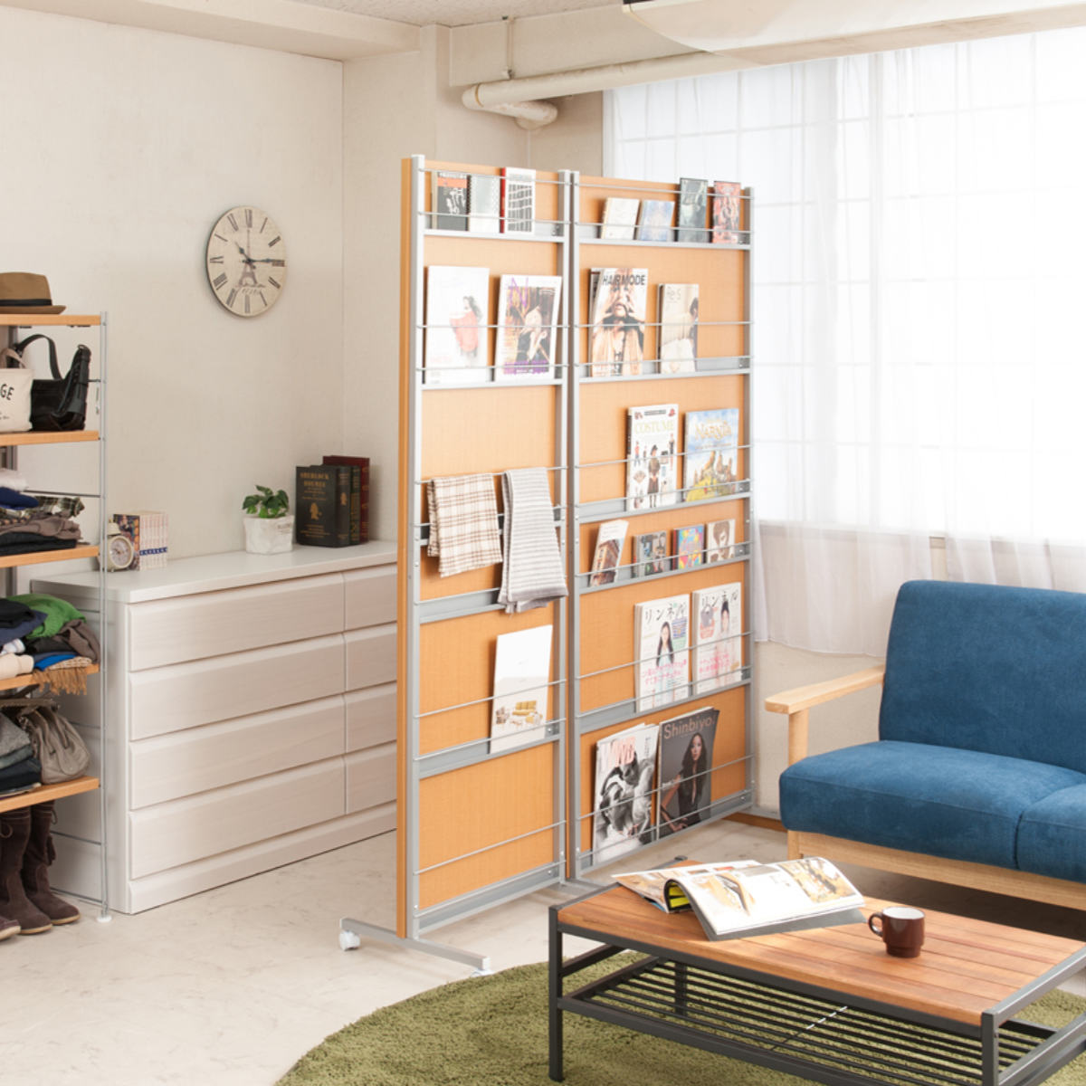 本棚やマガジンラックは奥行があり重厚感のあるものが多いですが、パーテーション式のこちらの製品は薄いので場所をとらず、更に目隠しもできるので様々な場所でご利用いただけます。