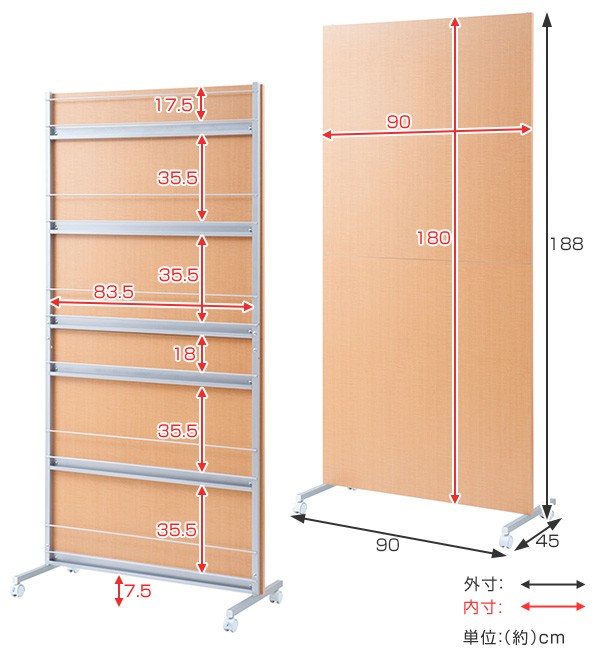 | サイズ | キャスター使用時:約 幅90×奥行45×高さ188(cm) ボード:約 幅90×厚み4.5×高さ180(cm) ラック部:約 幅83.5×奥行2×高さ(上から)17.5・35.5・35.5・18・35.5・35.5(cm) |