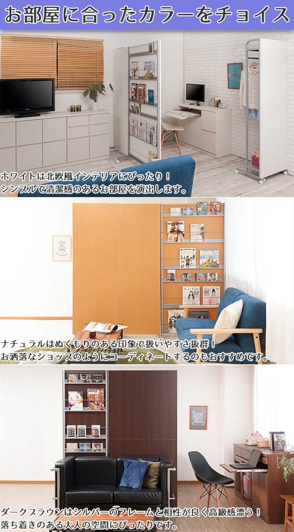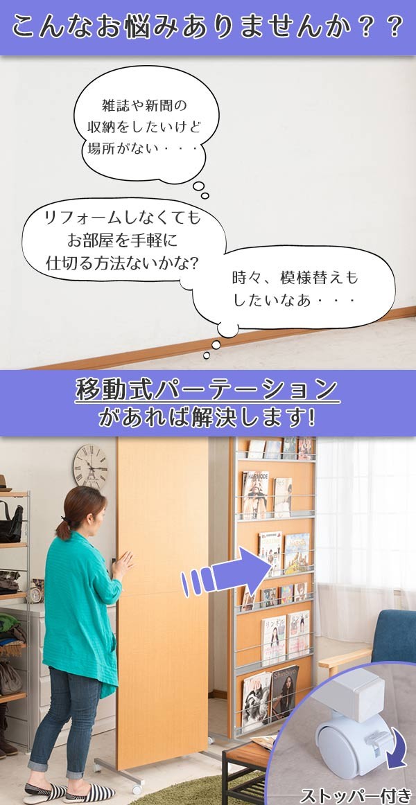 パーテーション 幅90cm 間仕切り マガジンラック キャスター付 ( 衝立 収納 移動式 本棚 雑誌収納 ついたて 両面 雑誌 本 片づけ パーティション 自立式 オフィス ホワイト ナチュラル ダークブラウン ) 【ホワイト】