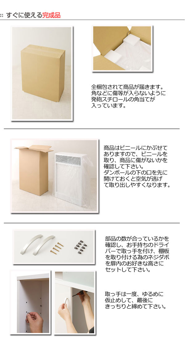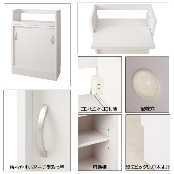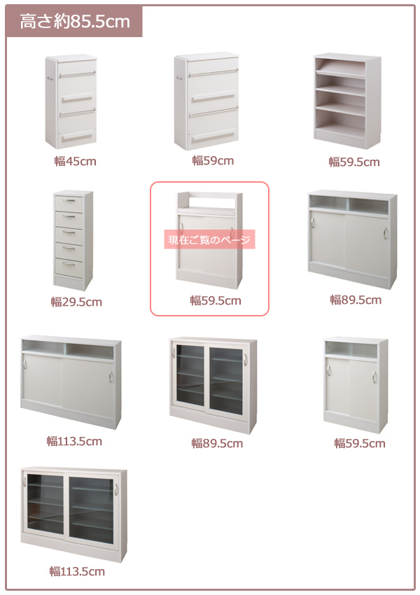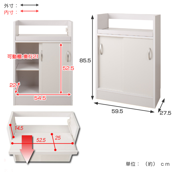 | サイズ | 本体:約 幅59.5×奥行27.5×高さ85.5(cm) 板引戸部内寸:約 幅54.5×奥行22×高さ52.5(cm) スライド棚内寸:約 幅52.5×奥行25×高さ14.5(有効高15.5)(cm) 可動棚:約 奥行21(cm) 重量:約13kg |