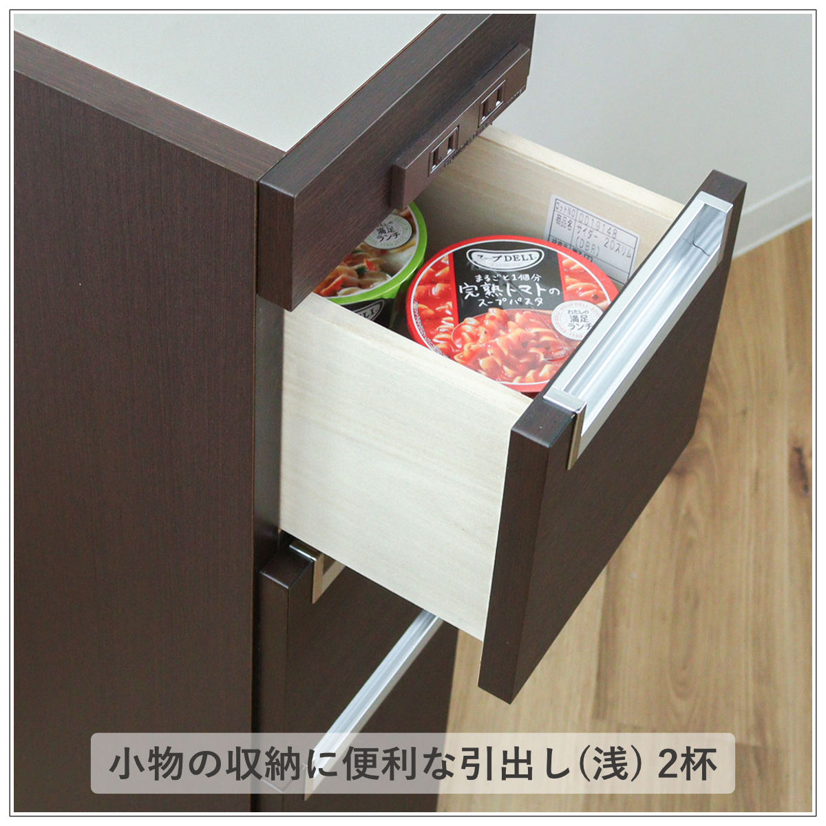 上2段の引出しは浅めで、収納した物が取り出しやすいので、キッチンの細々とした小物を綺麗に収納できます。抜け落ち防止のストッパー付きです。