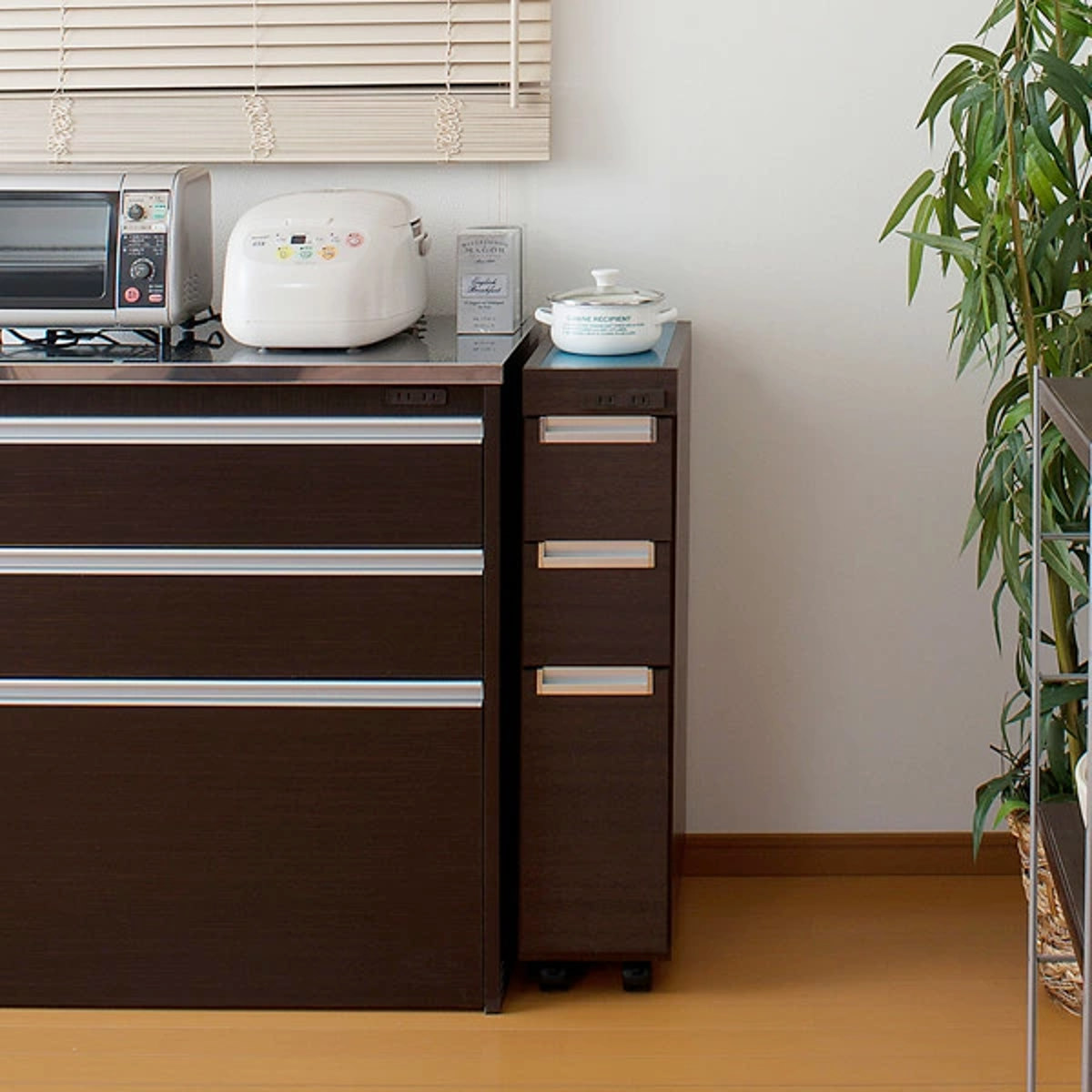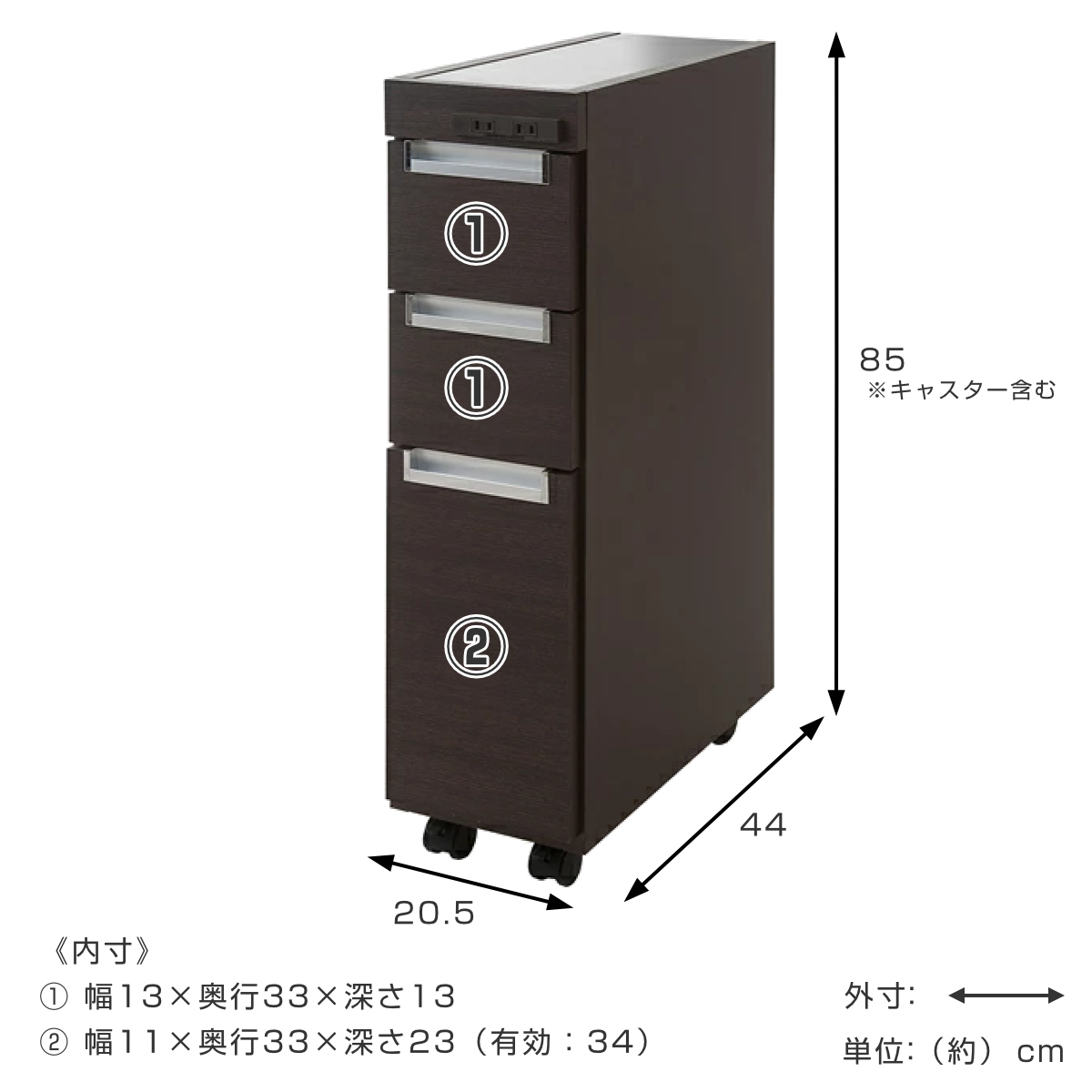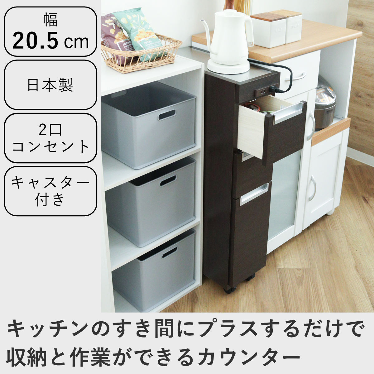 キッチンカウンター スリムカウンター ステンレストップ 幅20.5cm ( キッチンワゴン キッチン 収納 キッチンラック スリム 完成品 日本製 キッチン収納 ワゴン 隙間 すき間 省スペース 白 ブラウン キャスター付き コンセント付き ) 【ダークブラウン】