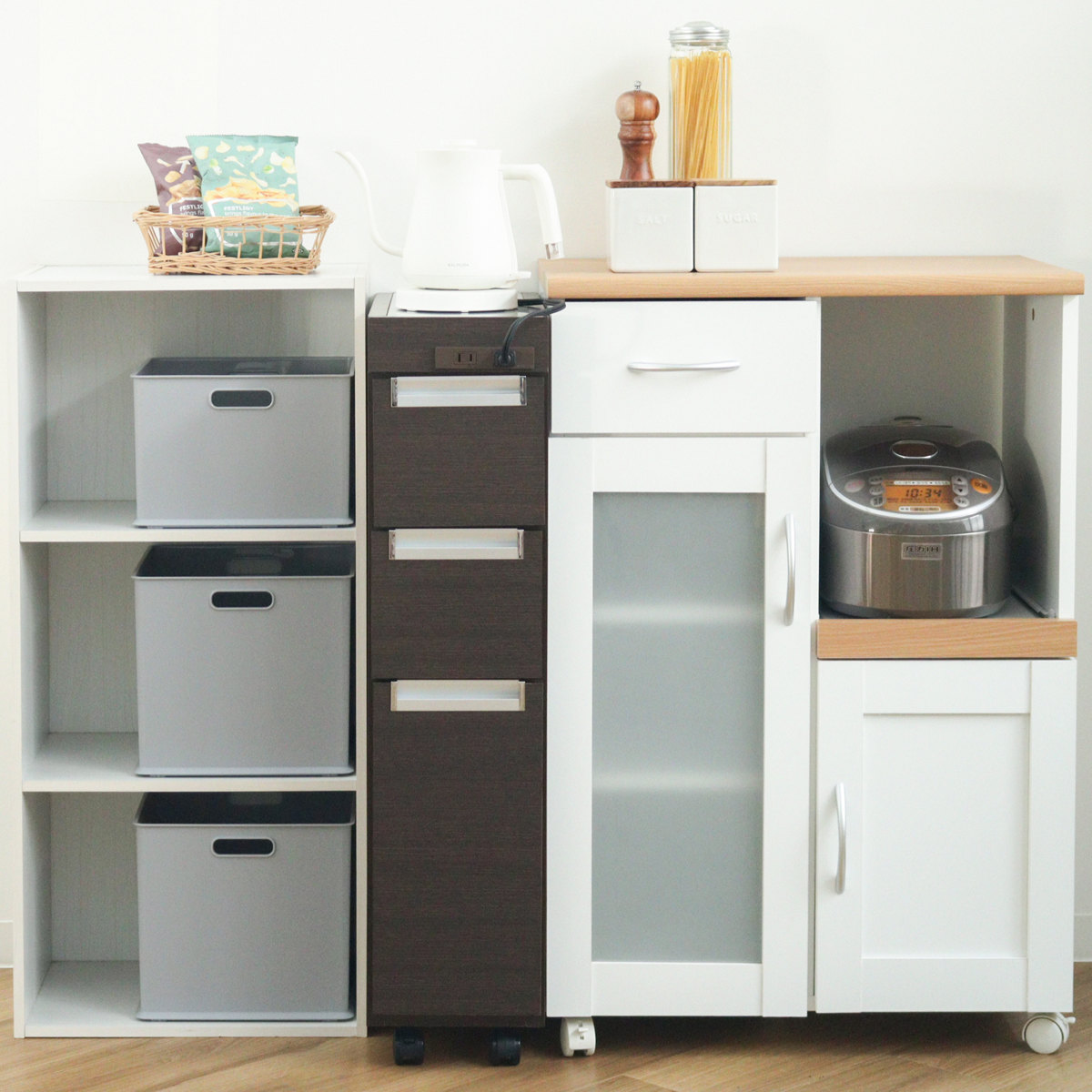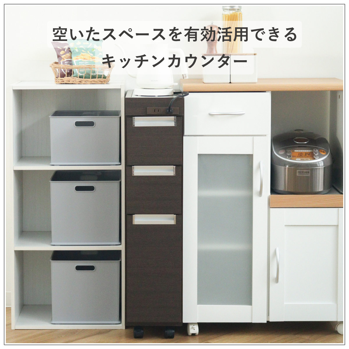 シンク横の空いた隙間に設置して便利にお使いいただける、スリムなキッチンカウンターです。システムキッチンとも合わせやすいフラットなデザインは、様々なインテリアになじみやすく、置く場所を選びません。