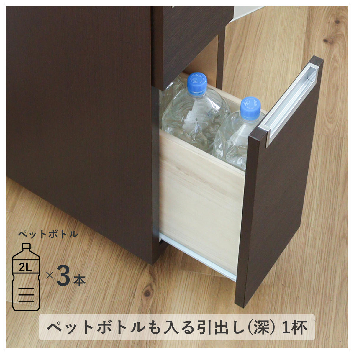 最下段の深型の引出しには、2リットルのペットボトルを3本収納できます。スライドレール付きで重い物を入れても、開閉がスムーズです。