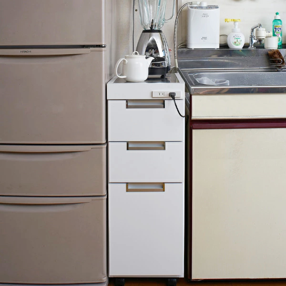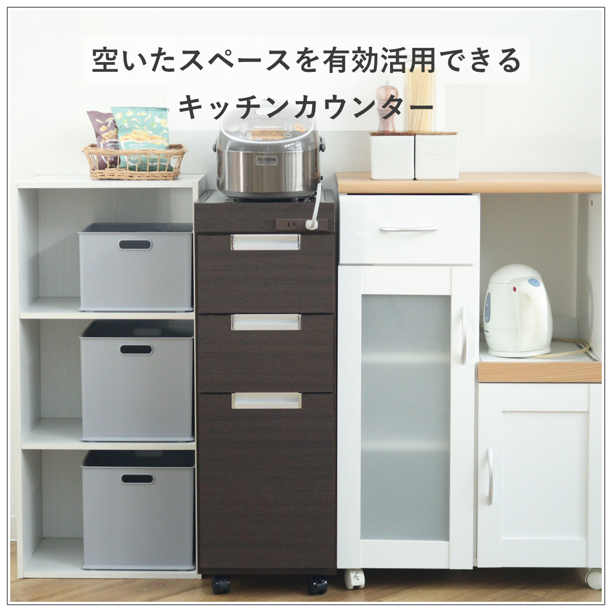 シンク横の空いた隙間に設置して便利にお使いいただける、スリムなキッチンカウンターです。システムキッチンとも合わせやすいフラットなデザインは、様々なインテリアになじみやすく、置く場所を選びません。