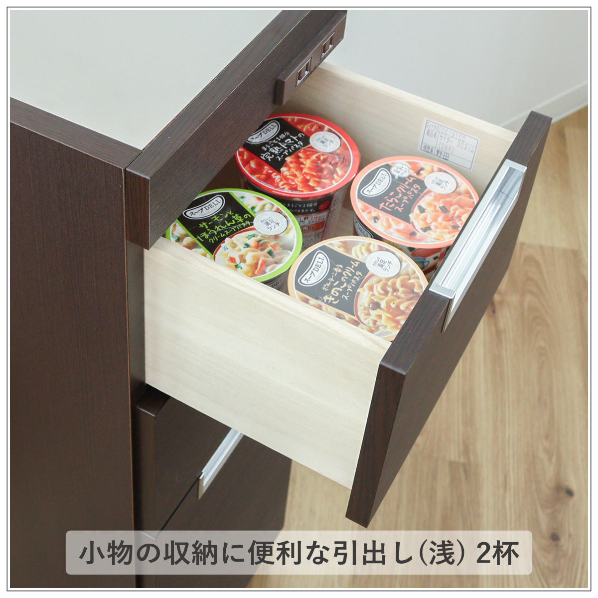 上2段の引出しは浅めで、収納した物が取り出しやすいので、キッチンの細々とした小物を綺麗に収納できます。抜け落ち防止のストッパー付きです。
