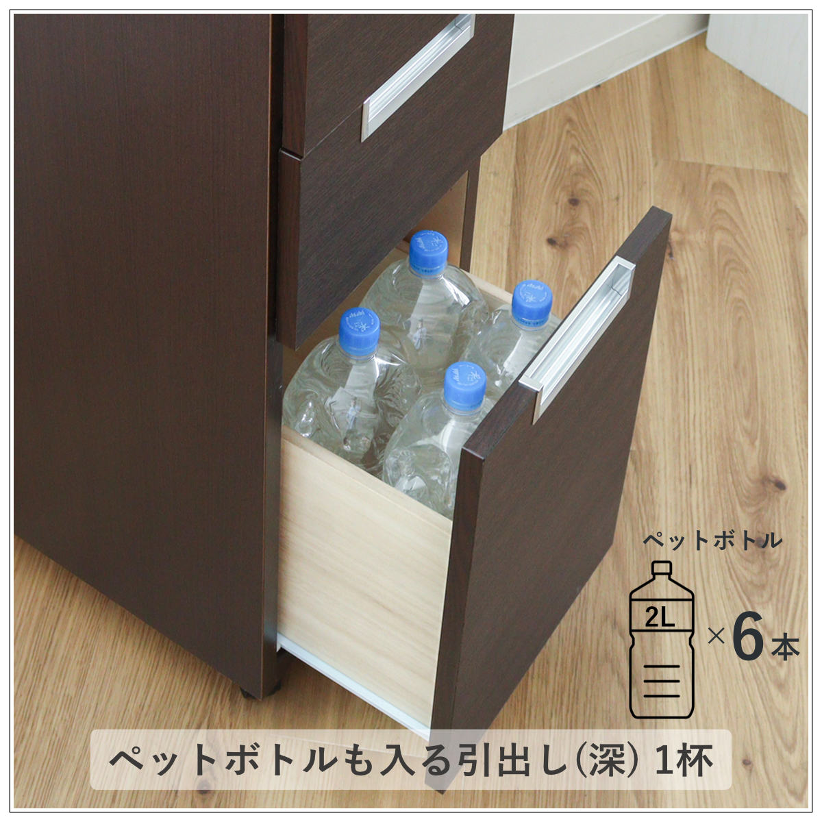 最下段の深型の引出しには、2Lのペットボトルを6本収納できます。スライドレール付きで重い物を入れても、開閉がスムーズです。