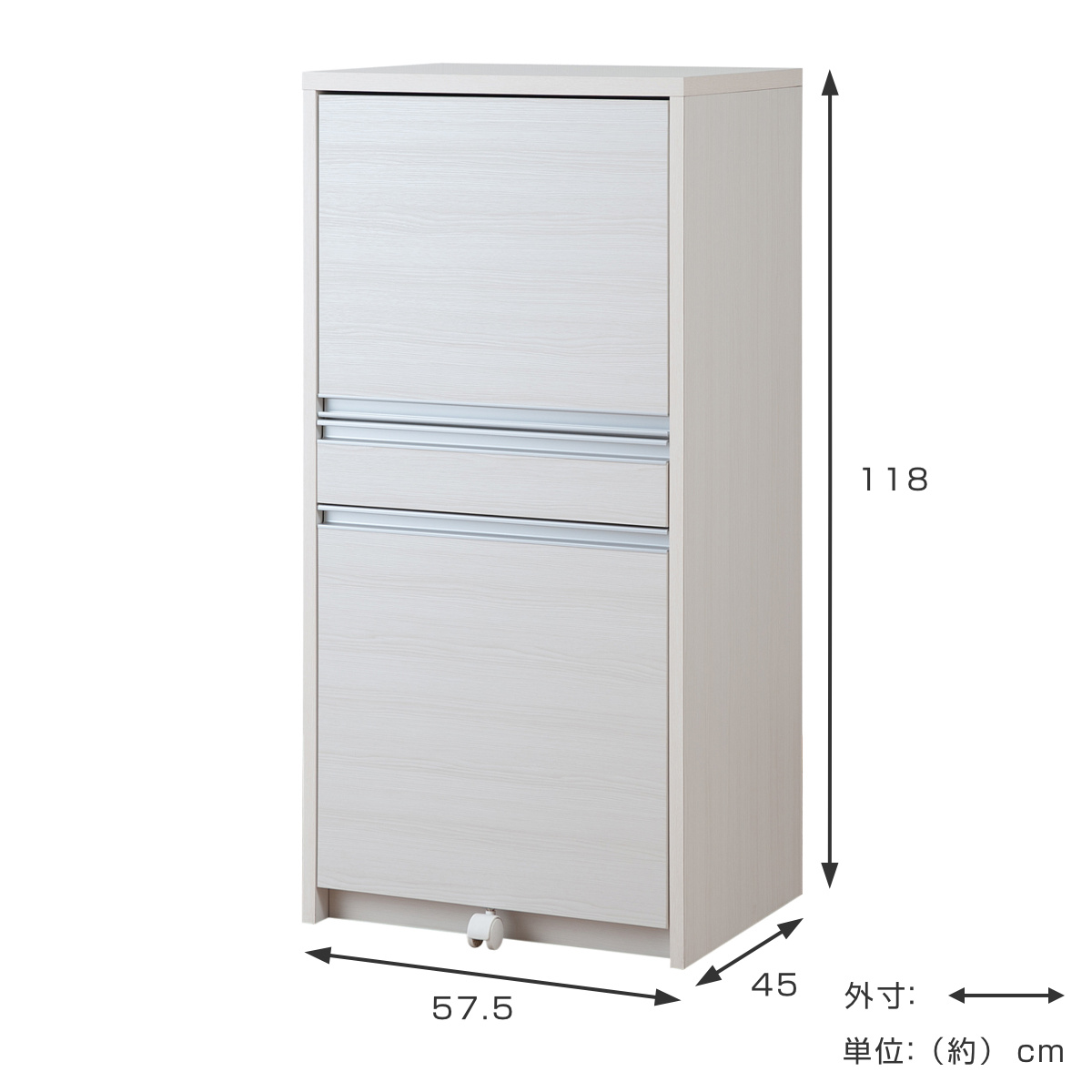 使用時のみ扉を開けて使うことが出来る、馴染みやすいホワイトカラーのキッチンラックです。ごちゃごちゃするキッチン周りのものを隠してスッキリと収納ができます。さらにゴミ箱付きで、ゴミ箱も引出し内に収納が可能です。