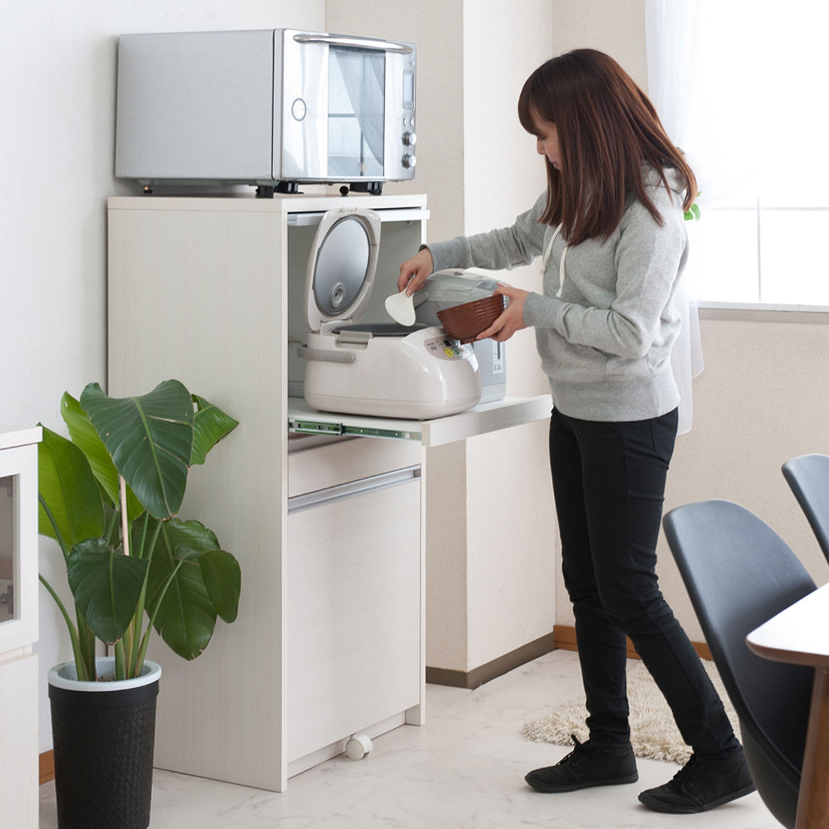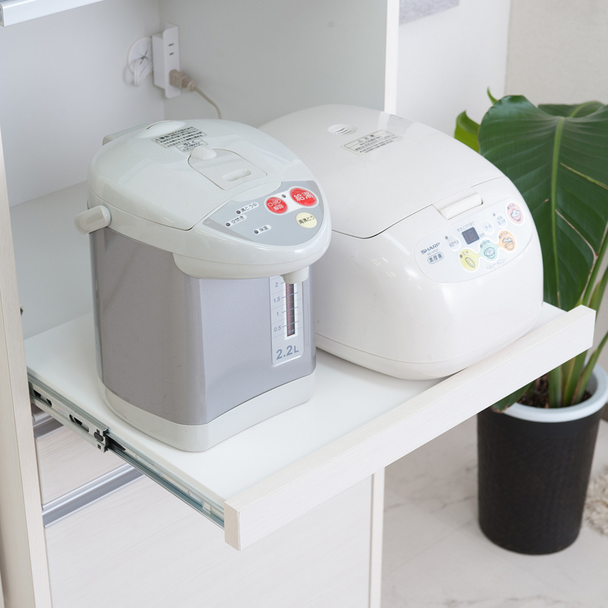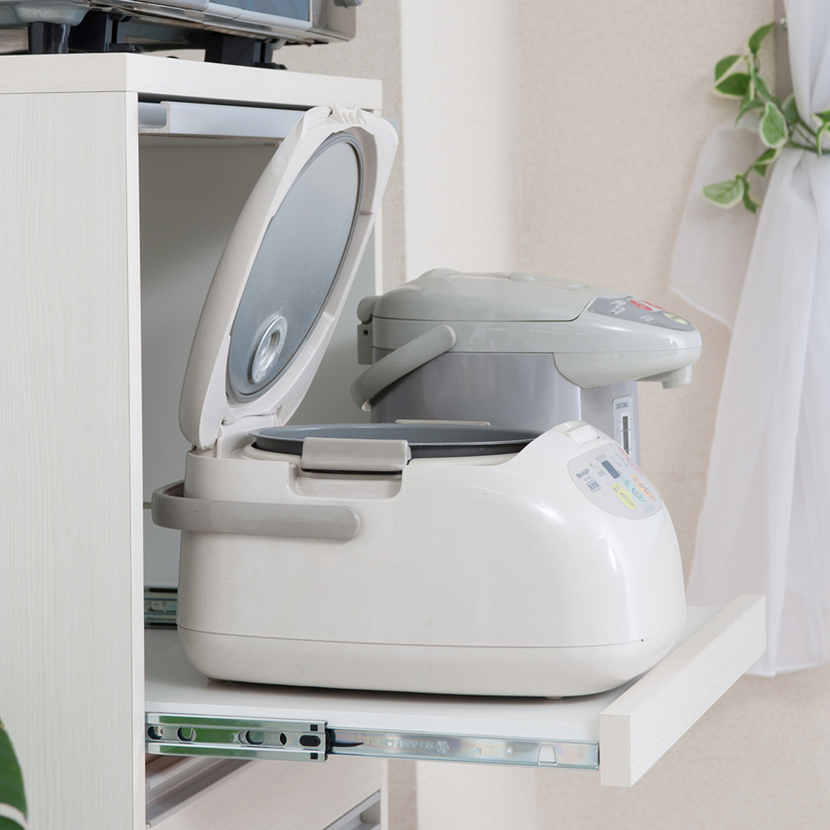 引出しがいっぱいまで出るフルスライドレール仕様です。炊飯器のふたも棚に当たる心配がなく使うことができ、奥の物も見やすく出し入れがしやすいです。