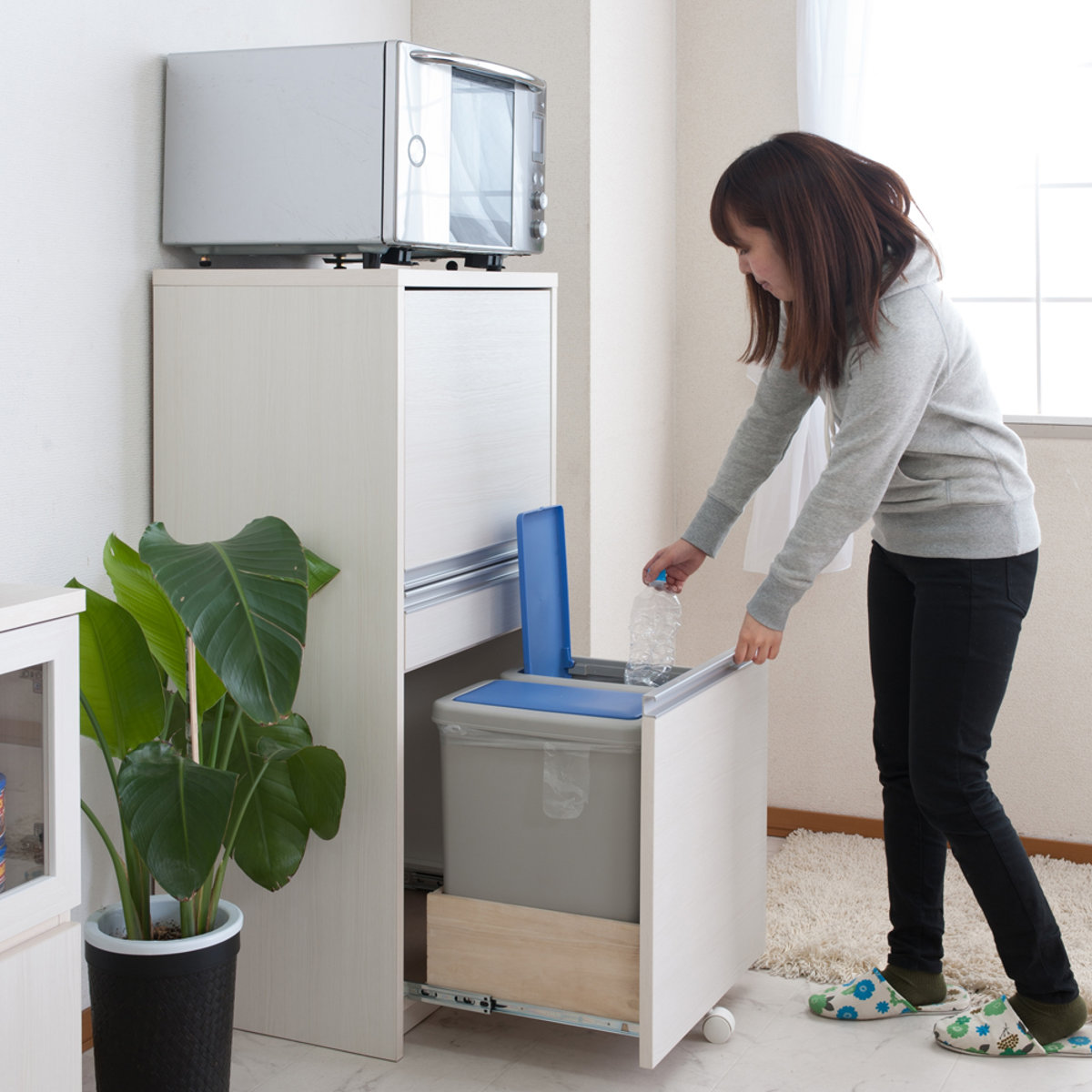 ごみ箱を出して別に使えば、下段の引出しには2リットルのペットボトルや米びつなど大きいものも収納できます。キャスター付きでスムーズに開閉が可能です。