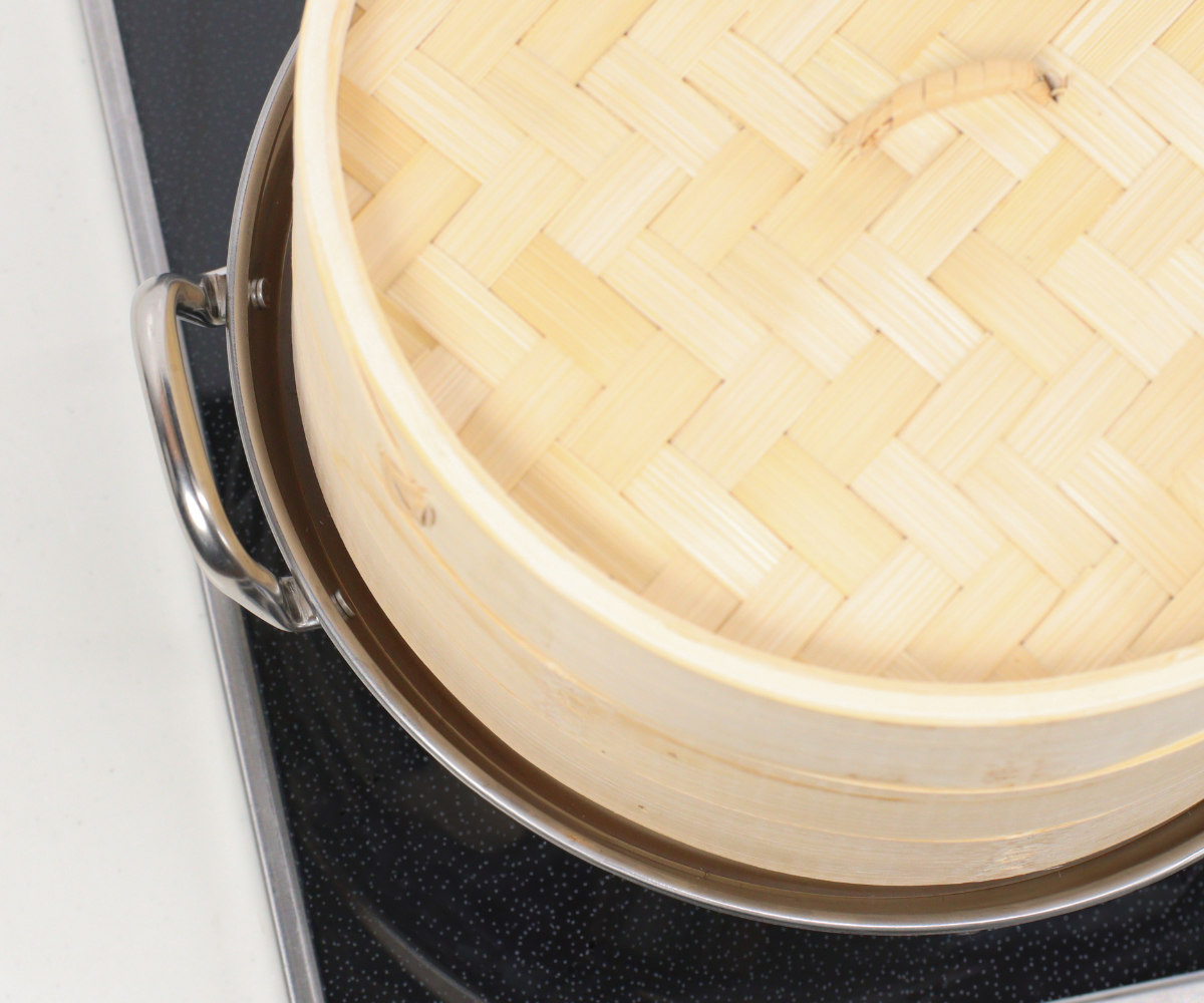 1.せいろを水でぬらします。せいろ全体がしっかりと水でぬれた状態にし、その後さっと水気を切ってください。