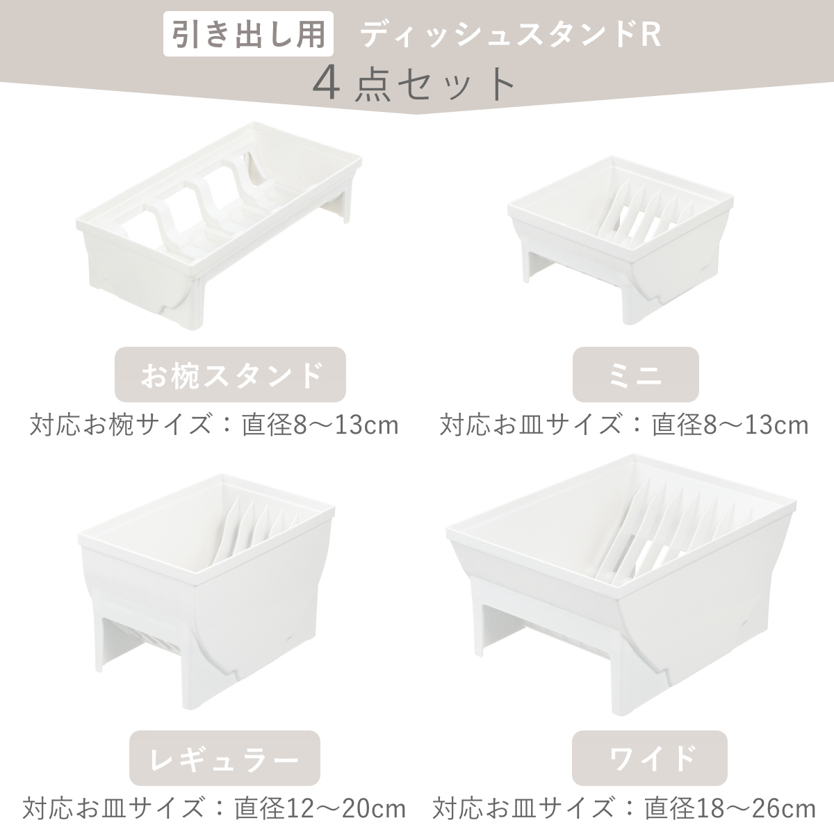 お椀スタンド(8~13cmのお椀やボウル)、ディッシュスタンドのミニ(8~13cm)、レギュラー(12~20cm)、ワイド(18~26cm)の4種類をご用意。使う場所や入れる食器に合わせて自由な組み合わせで深引き出しの整理整頓ができます。