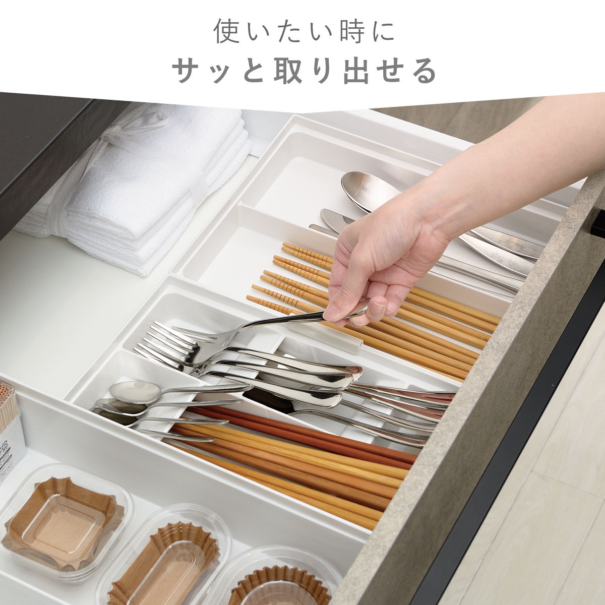 引き出しの中でサイズ別に分けて、様々なカトラリーの定位置を作り美しく収納できます。どこに何があるか引き出しを開けたときに分かりやすく、出したカトラリーをどこに戻すかも一目瞭然です。