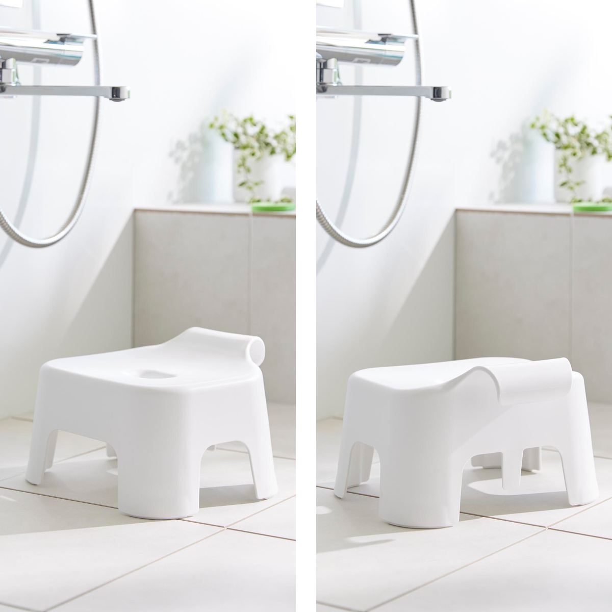 イスの背面にはシャワーフックに差し込めるプレートが付いてます。フックで引っ掛けるだけでなく、プレートをシャワーフックに差し込んで浮かせて収納できます。