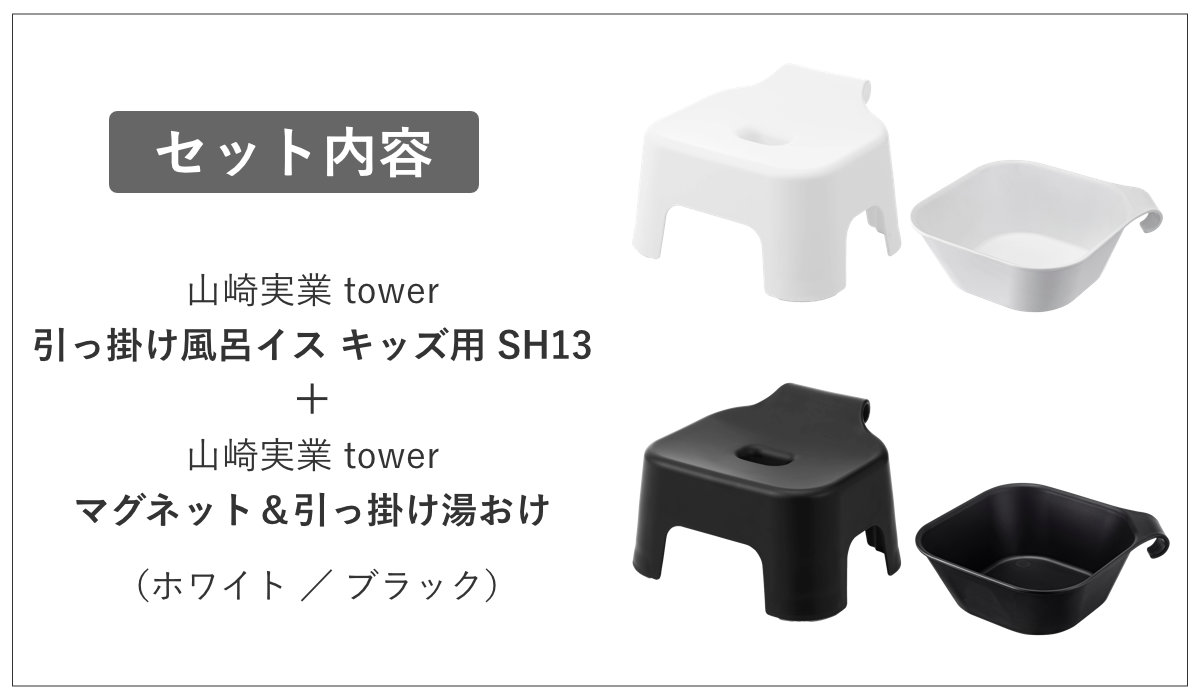 山崎実業 tower 引っ掛け風呂イス キッズ用 SH13+マグネット&引っ掛け湯おけ セット タワー ( 4903208053785 タワーシリーズ 洗面器 バスチェア 風呂おけ 磁石 桶 吊り下げ 風呂いす 風呂椅子 子ども用 ) 【ホワイト】