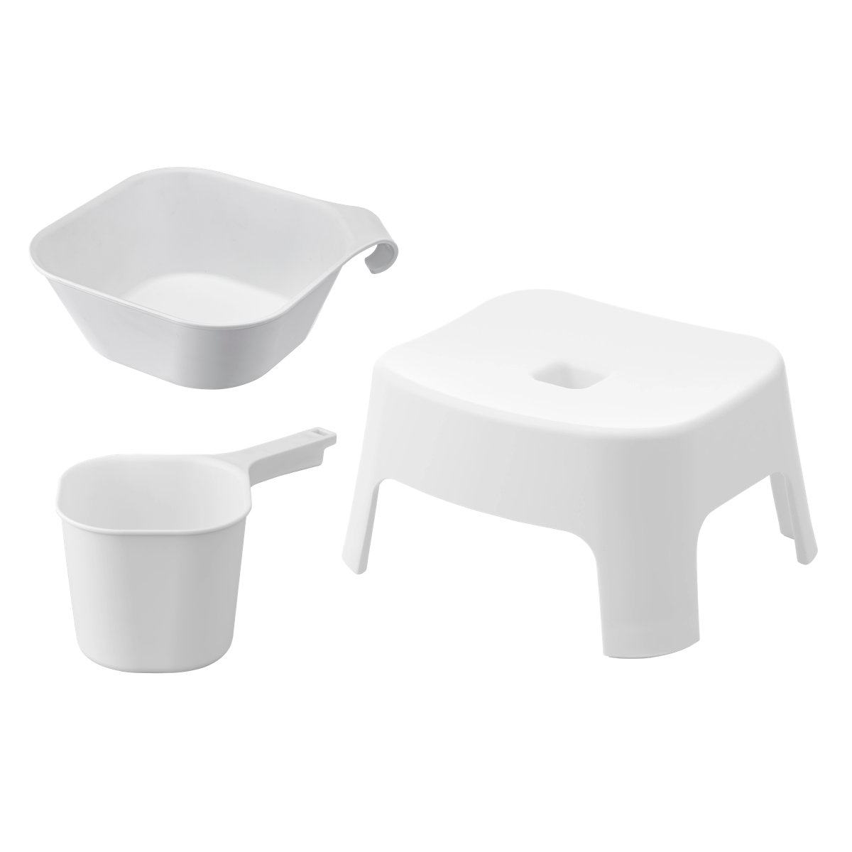 浴室の壁面にマグネットでピタっとくっつく風呂イスと手おけ、浴室のバーや扉に引っ掛けられる湯おけの3点セットです。浴室の床に直接置かないので、ヌメリや水垢が付くのを防ぎ、清潔に収納できてお掃除もラクラクです。シンプルなデザインで、お風呂のどこに置いても馴染みます。