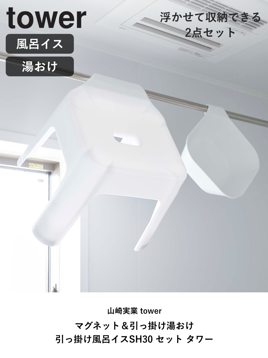 山崎実業 tower 引っ掛け風呂イス SH30+マグネット&引っ掛け湯おけ セット タワー ( 4903208053785 タワーシリーズ 洗面器 風呂おけ 磁石 桶 吊り下げ 壁面 壁 収納 フック 浮かせて収納 バスチェア ) 【ブラック】