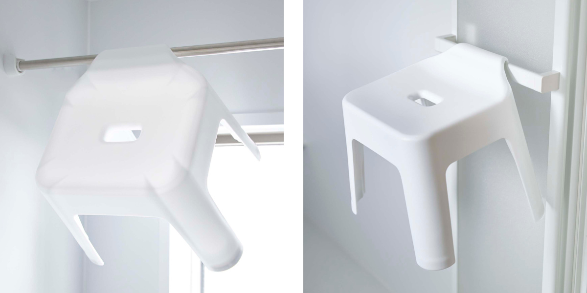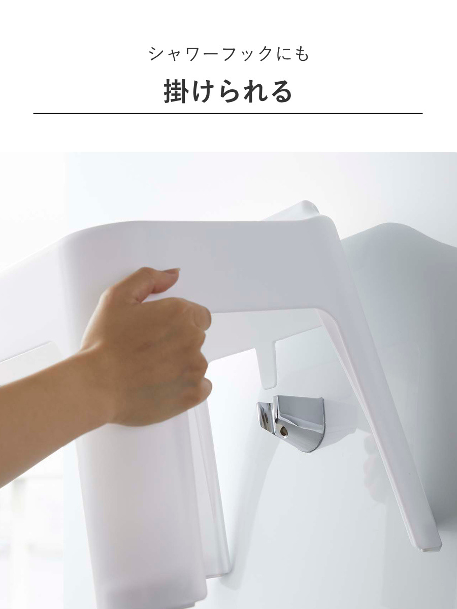 イスの背面にはシャワーフックに差し込めるプレートが付いてます。フックで引っ掛けるだけでなく、プレートをシャワーフックに差し込んで浮かせて収納できます。