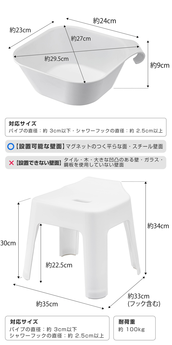 | 対応サイズ | 【マグネット&引っ掛け湯おけ】 パイプの直径/約3cm以下、シャワーフックの直径/約2.5cm以上 【引っ掛け風呂イス】 パイプの直径:約3cm以下、シャワーフックの直径:約2.5cm以上 |