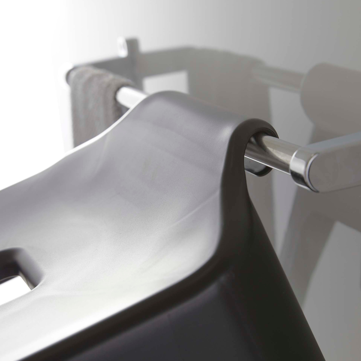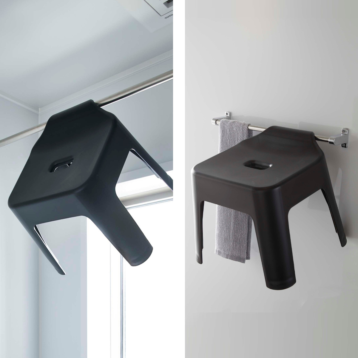 イスの背面にはシャワーフックに差し込めるプレートが付いてます。フックで引っ掛けるだけでなく、プレートをシャワーフックに差し込んで浮かせて収納できます。