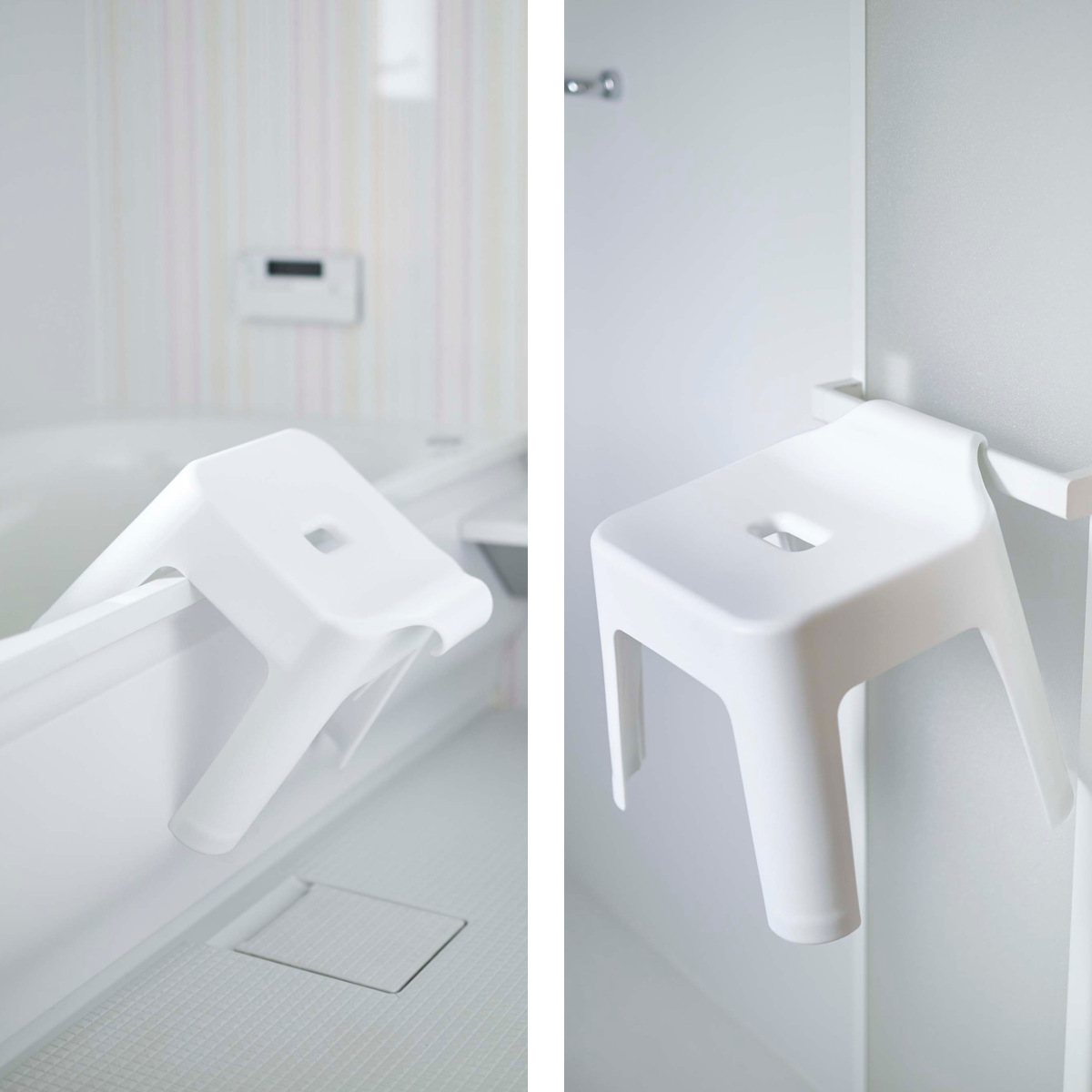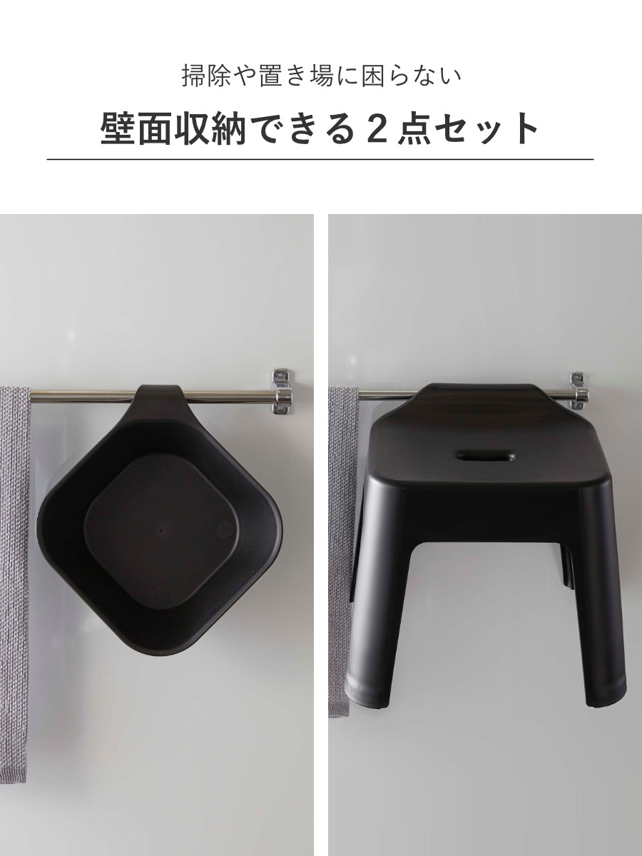 浴室のバーや扉に引っ掛けられる風呂イスとマグネットでピタっとくっつく湯おけのセットです。浴室の床に直接置かないので、ヌメリや水垢が付くのを防ぎ、清潔に収納できてお掃除もラクラクです。シンプルなデザインで、お風呂のどこに置いても馴染みます。