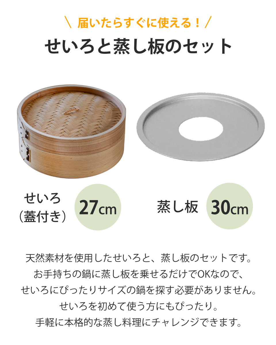 ![]() せいろ24cm+蒸し板セット | ![]() せいろ27cm+蒸し板セット 【▲このページの商品】 |