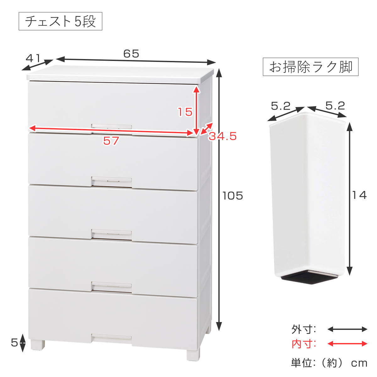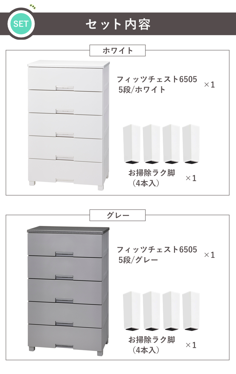 | 内容量 | 【セット内容】 ・フィッツチェスト 5段×1台 (付属品:すべり止め付き専用脚×4個) ・お掃除ラク脚(4個入り)×1セット |