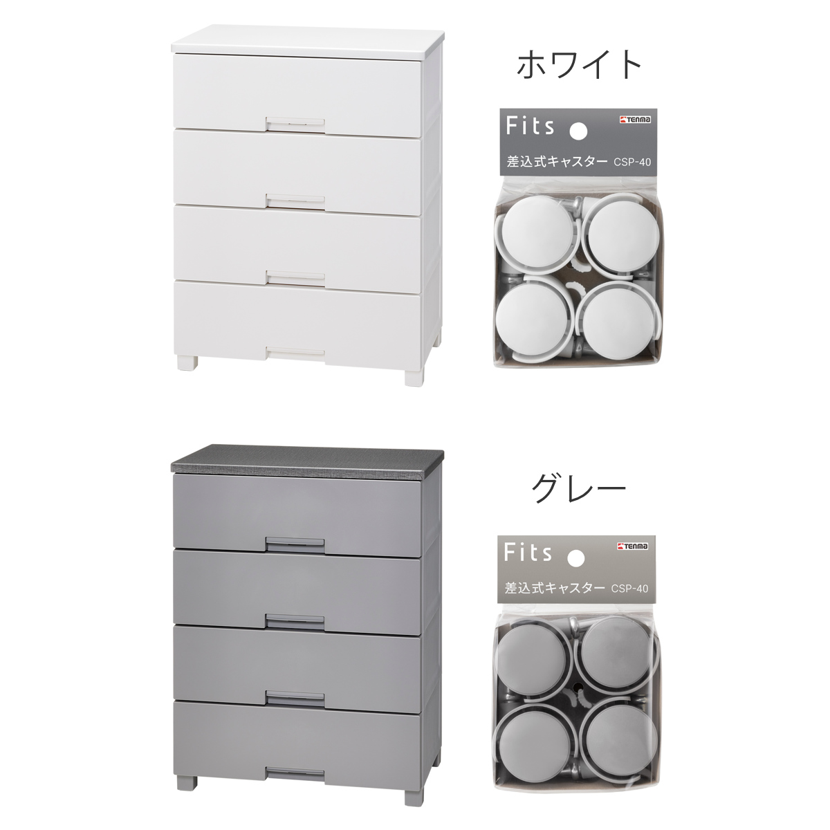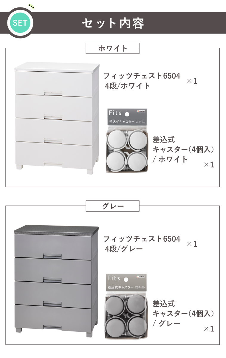 | 内容量 | 【セット内容】 ・フィッツチェスト 4段×1台 (付属品:すべり止め付き専用脚×4個) ・キャスター(4個入り)×1セット |