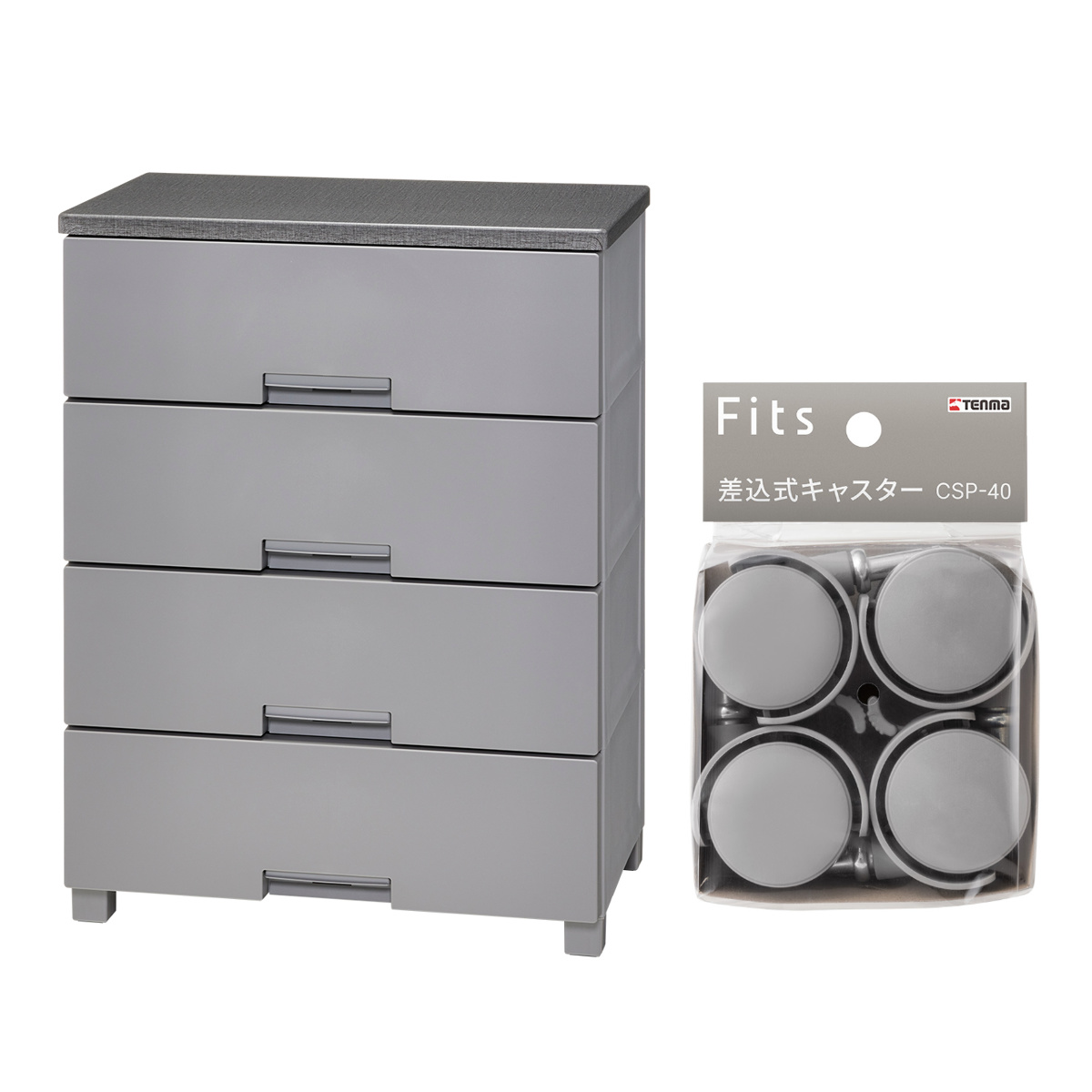 | 内容量 | 【セット内容】 ・フィッツチェスト 4段×1台 (付属品:すべり止め付き専用脚×4個) ・キャスター(4個入り)×1セット |