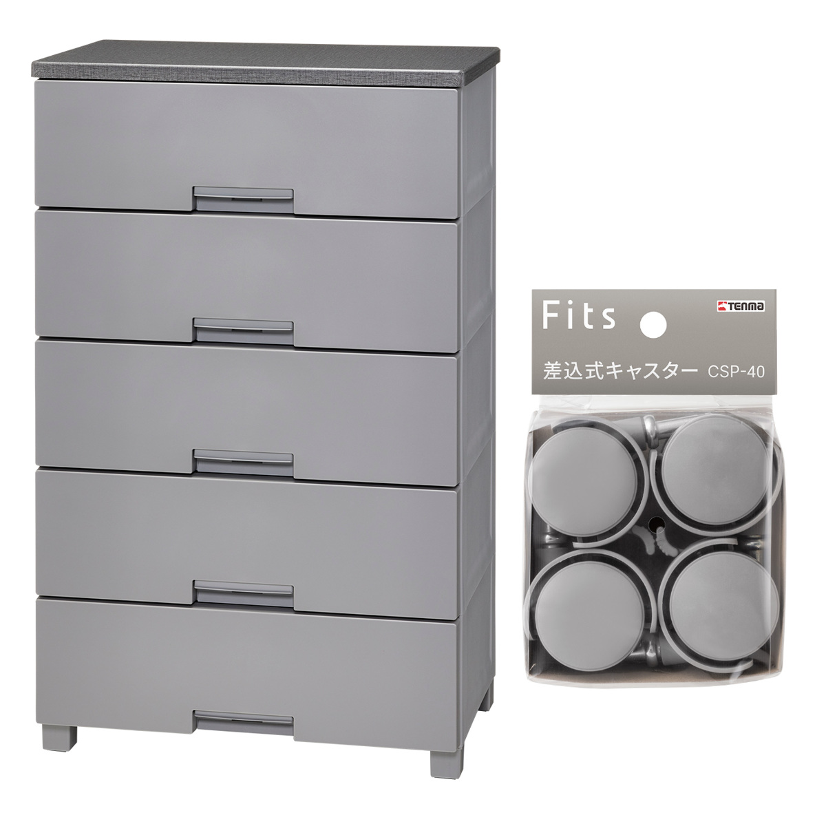 | 内容量 | 【セット内容】 ・フィッツチェスト 5段×1台 (付属品:すべり止め付き専用脚×4個) ・キャスター(4個入り)×1セット |