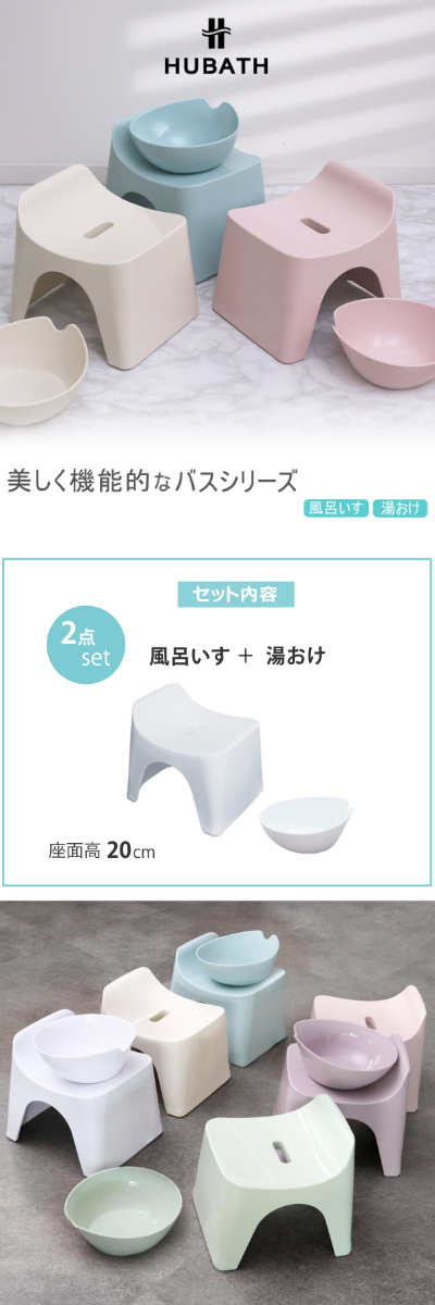 風呂椅子 20cm 湯桶 2点セット ヒューバス バススツール×ウォッシュボール 日本製 ( 風呂イス 風呂いす 座面高さ20cm 湯おけ 洗面器 風呂おけ HUBATH バスチェア バススツール 風呂 椅子 ウォッシュボール 風呂桶 手おけ お風呂 ) 【ホワイト】