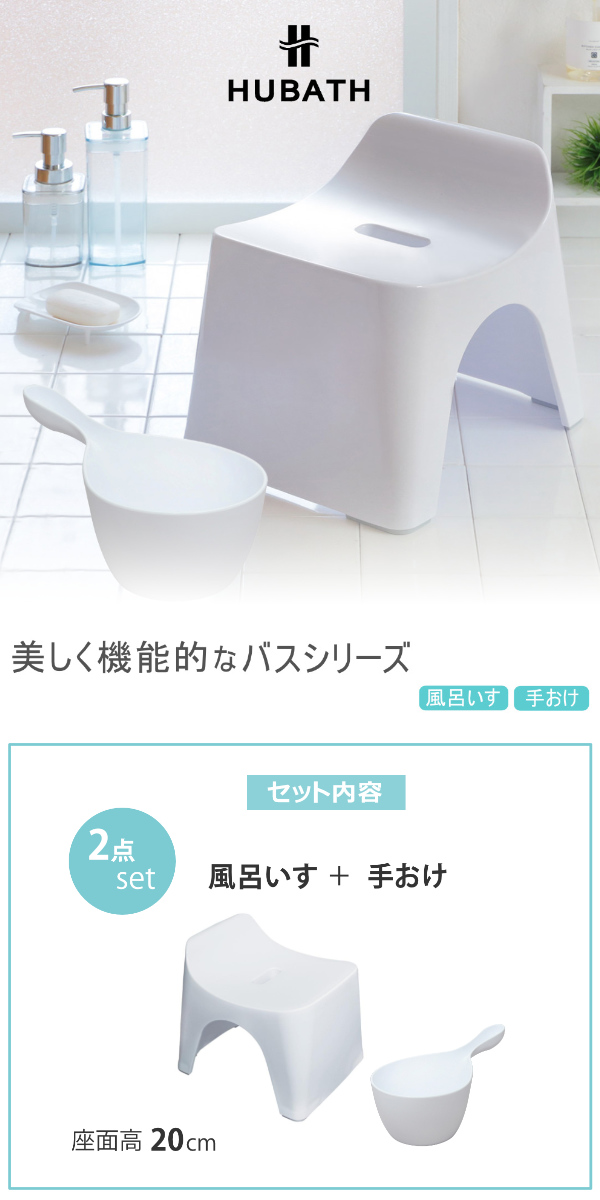 シンプルなデザインと使いやすさを追求した風呂いすと手おけのセットです。座面高20cmのコンパクトなサイズでお子様にもお使いいただけます。