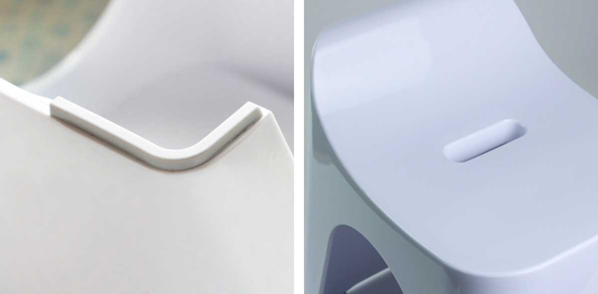| すべり止め付き 床との接地部分にキズ防止効果のあるすべり止めが付いています。 | 持ち運びラクラク 座面の穴に手を入れて持ち運びでき、移動も簡単です。 |
