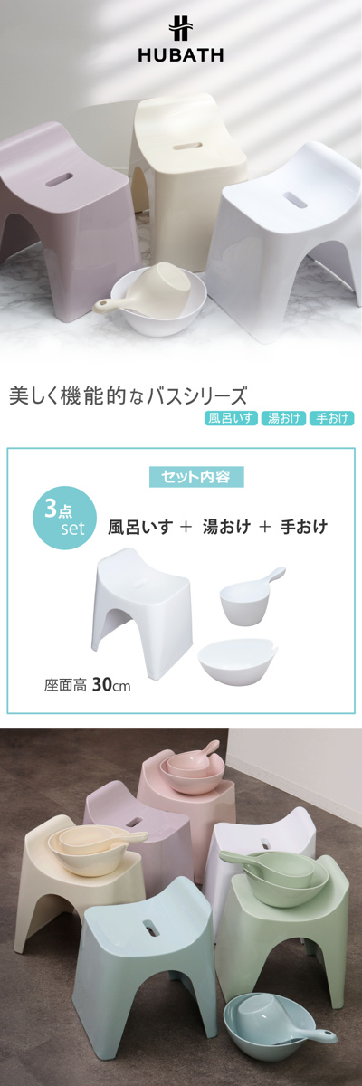 シンプルなデザインと使いやすさを追求した風呂いす、湯おけ、手おけの3点セットです。座面高25cmのコンパクトなサイズでお子様にもお使いいただけます。