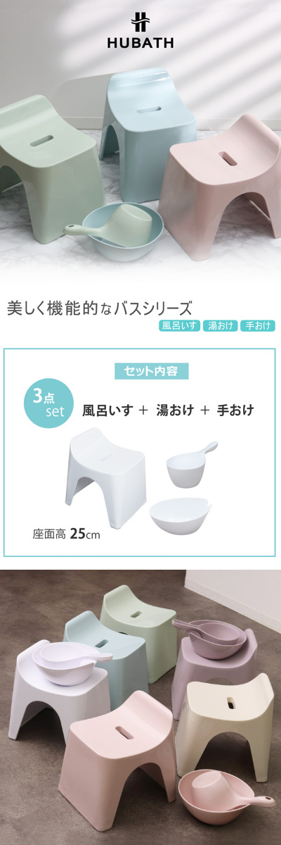 シンプルなデザインと使いやすさを追求した風呂いす、湯おけ、手おけの3点セットです。座面高25cmのコンパクトなサイズでお子様にもお使いいただけます。