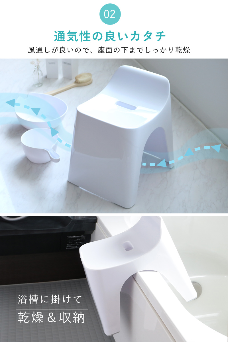 大きく開いたアーチ型の開口部は通気性をしっかりと確保し、湿気がこもりにくい構造です。浴槽に掛けて収納できるので、効率的に乾燥させて水垢やカビの発生を抑えます。