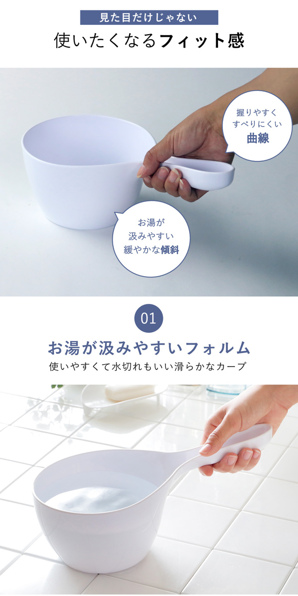 緩やかな傾斜があり、お湯が汲みやすいフォルムの手おけです。折り返しのないフォルムは美しいだけでなく、汚れがつきにくいのもポイント。
