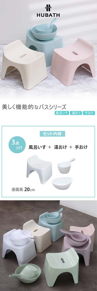 風呂椅子 20cm 湯桶 手桶 3点セット ヒューバス バススツール×ウォッシュボール×ハンディーボール 日本製 ( 風呂いす 洗面器 風呂おけ バスチェア HUBATH お風呂イス 高さ 20 コの字 防カビ 滑り止め ) 【グレイッシュパープル】