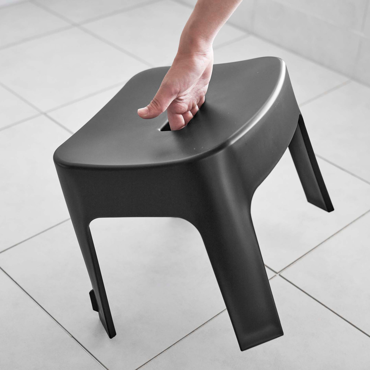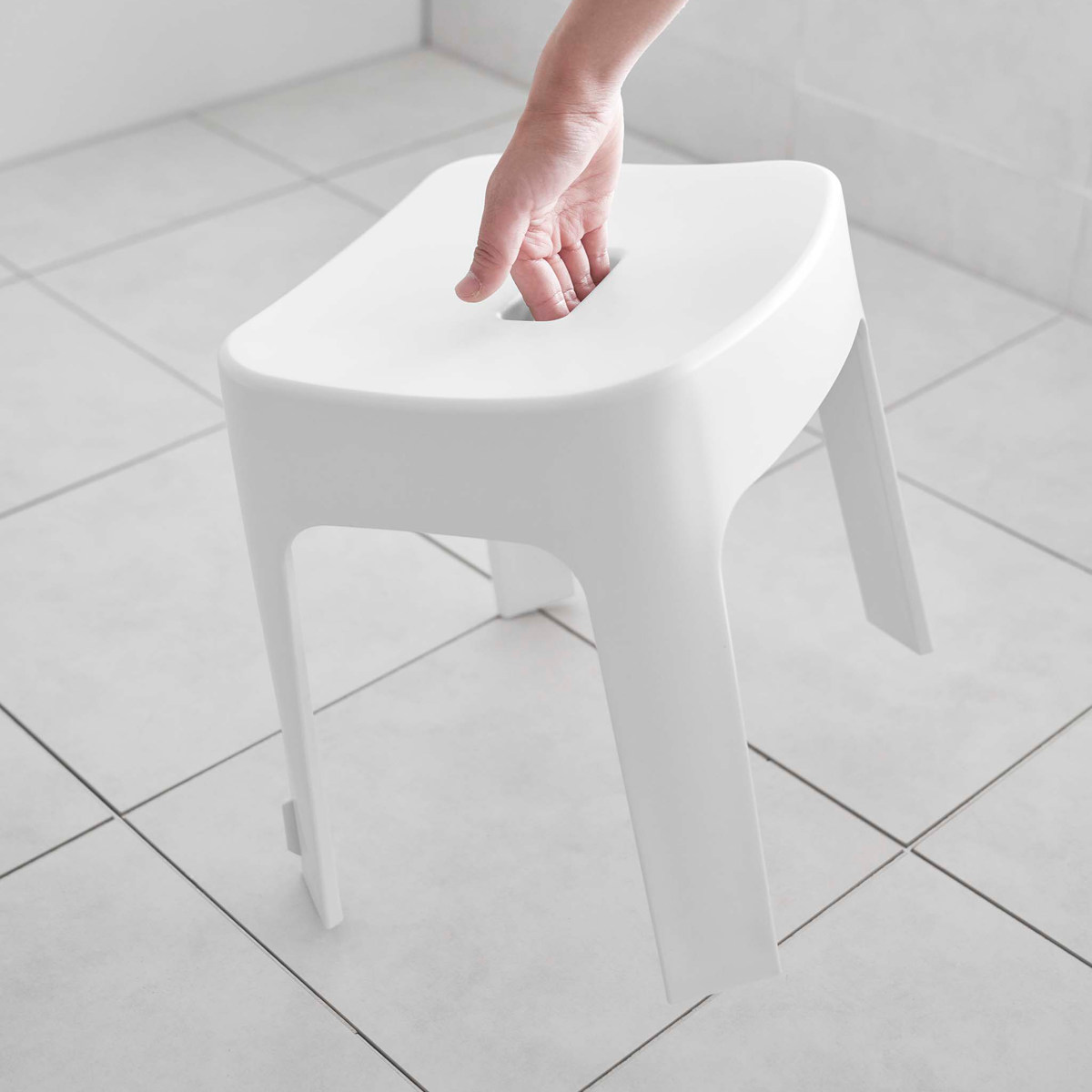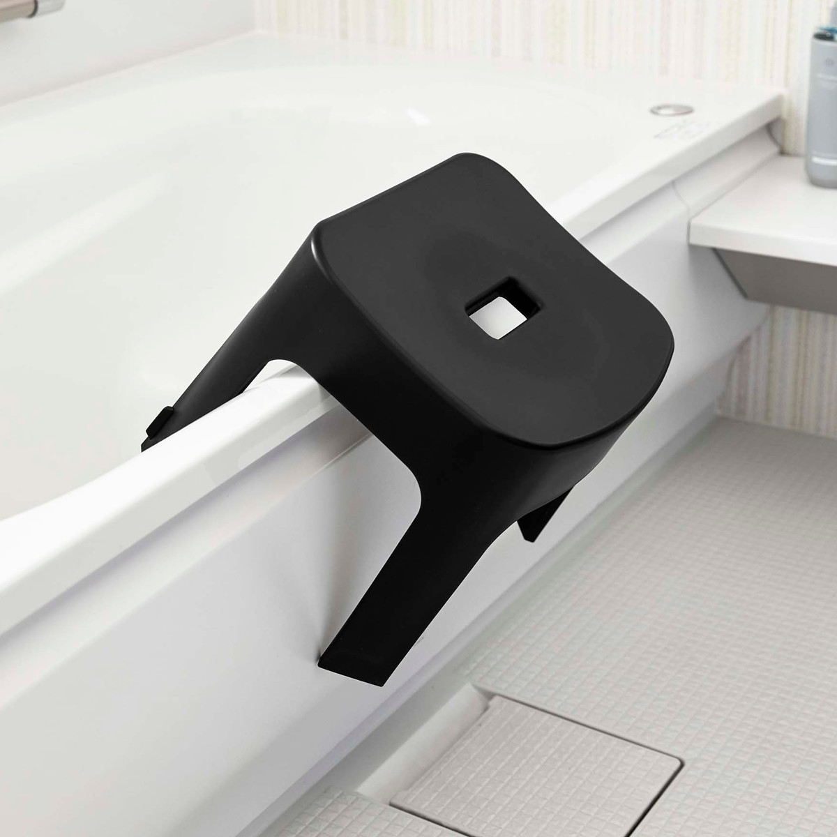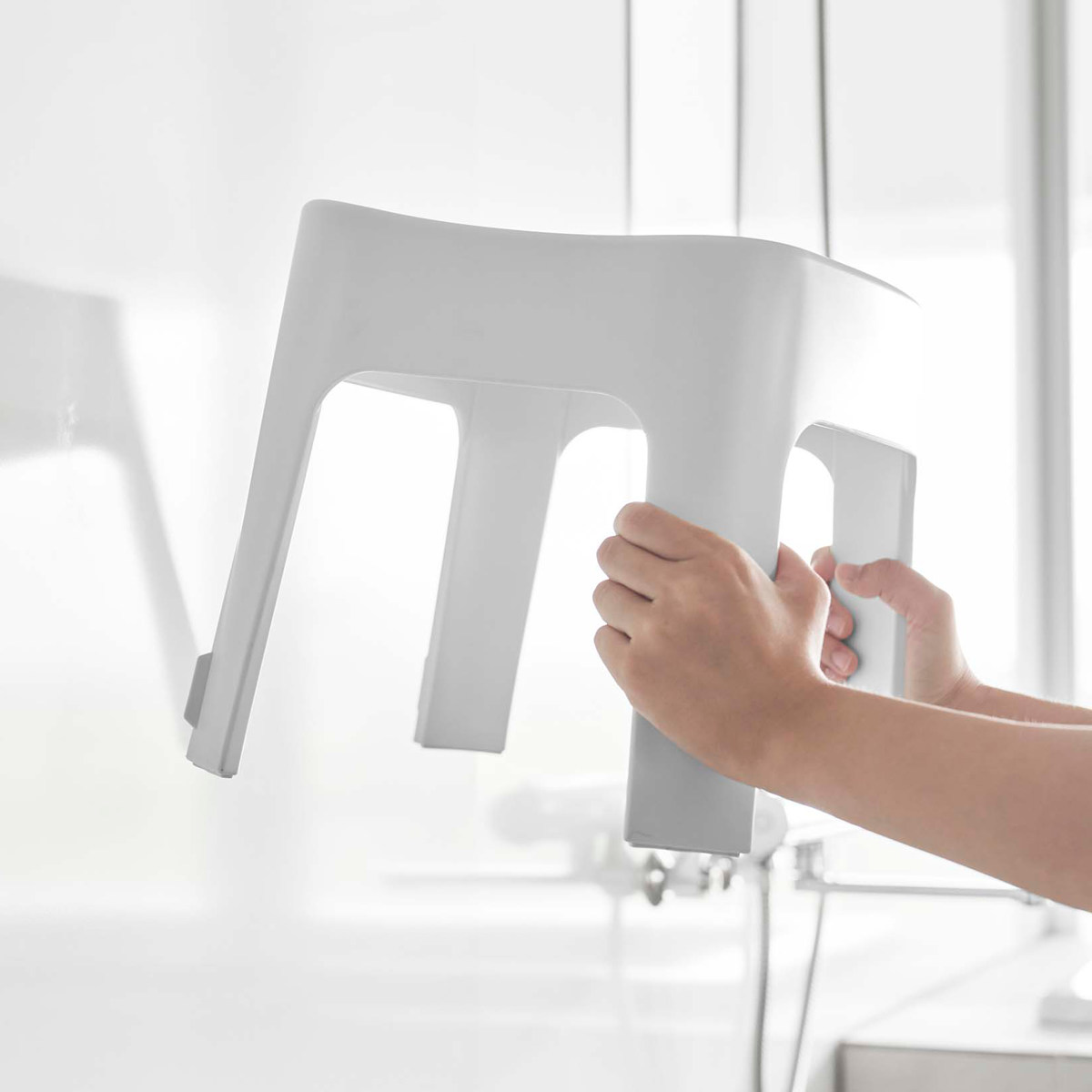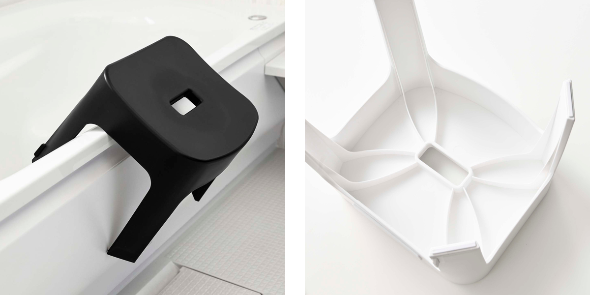 | 引っ掛け収納も可能 マグネットが使えない場合でも、バスタブの縁に掛ければ直接床に置かずに乾かせるので衛生的です。 | 安心して座れる 座面裏にリブを設けることで、強度を高めました。耐久性が向上し、安心感のある座り心地を実現しました。 |